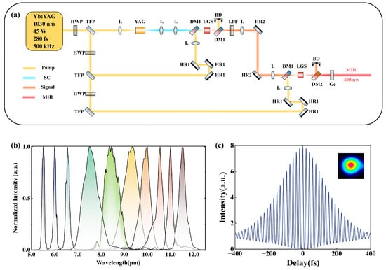 To generate MIR femtosecond laser pulses for resonant corneal tissue ablation, we constructed a home-built two-stage OPA system based on LGS crystals. LGS crystals were selected owing to their broad transparency window, high damage threshold, and favorable phase-matching characteristics in the MIR region. As schematically illustrated in Figure 2a, the OPA system was pumped by a laser source operating at a center wavelength of 1030 nm with an average power of 45 W, a pulse duration of 280 fs, and a repetition rate of 500 kHz.