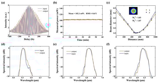 As shown in Figure 4a, taking the MIR femtosecond pulses centered at 6.4 μm as an example, the temporal profile of the output pulses after AR-HCF transmission remains highly consistent with that of the input pulses. The autocorrelation trace exhibits good temporal symmetry, with no observable pulse trailing or structural distortion. The output pulse duration is approximately 360 fs. The slight temporal broadening relative to the input pulses can be attributed to the accumulated dispersion of the optical components in the system. Specifically, the 0.2 m-long AR-HCF introduces a dispersion of approximately −1160 fs2 at 6.4 μm, whereas the CaF2 collimating lens (f = 300 mm) and focusing lens (f = 50 mm) used for fiber coupling introduce material dispersions of approximately −2299 fs2 and −8768 fs2, respectively, which dominate the total dispersion budget. Therefore, the observed pulse broadening is primarily caused by coupling optics rather than by fiber itself. Theoretically, these dispersion values would lead to pulse broadening to 354 fs, which is close to our experimentally measured value (360 fs).
