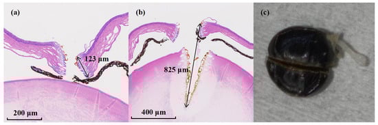 H&E-stained histological sections of tissue ablation performed at a scanning speed of 0.5 mm/s. The arrows indicate the ablation depth, with the measured values labeled adjacent to the arrows. (a) H&E-stained corneal section after two scans along the same trajectory. (b) H&E-stained corneal section after six scans along the same trajectory. (c) Photograph of the corneal ablation region after six scans along the same trajectory.