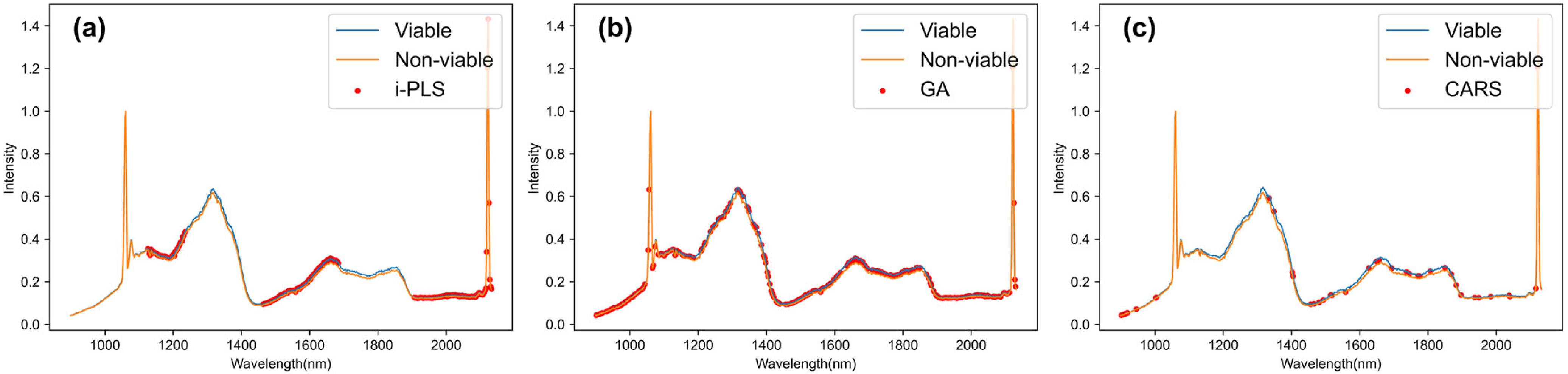 - Zhang, T.-t.; Xiang, Y.-y.; Yang, L.-m.; Wang, J.-h.; Sun, Q. Wavelength Variable Selection Methods for Non-Destructive Detection of the Viability of Single Wheat Kernel Based on Hyperspectral Imaging. Spectrosc. Spectr. Anal. 2019, 39, 1556–1562. [Google Scholar]