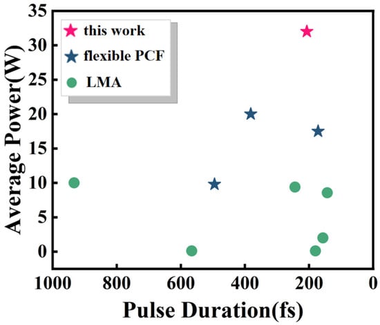 Recently, flexible PCF has been employed as the gain fiber in CPA systems as the main amplifier. In 2018, an experimental study on fully welded PCF femtosecond CPA was reported, achieving a compressed average power of up to 9.8 W at a repetition rate of 275 kHz with a pulse duration of 495 fs [22]. In 2019, amplification was achieved in a PCF with a core/cladding diameter of 40/200 µm, achieving an output power of 17.5 W with a pulse duration of 172 fs [23]. In 2021, a nonlinear CPA technique was reported, utilizing self-phase modulation in a fiber stretcher for pulse shaping. At a repetition rate of 1 MHz, it delivered a duration of 382 fs and an average power of 20 W [24]. This method combines the advantages of LMA fibers and rod-type PCFs, it ensures beam quality and enhances the nonlinear effect threshold without requiring complex spatial coupling. Precise control of the PCF length effectively reduces the accumulation of higher-order dispersion, making it an approach for generating high-power femtosecond fiber lasers. Figure 1 shows the performance comparison of all-fiber amplifiers in terms of pulse duration and average power.