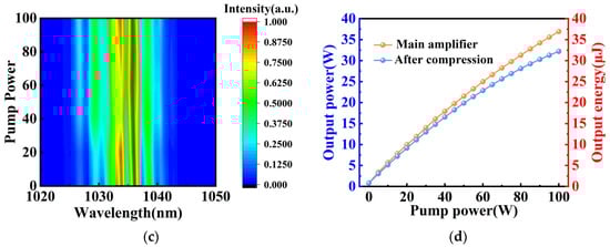 where γ represents the nonlinear parameter, P0 represents the peak power of the input signal, g represents the gain coefficient of the fiber, and Lg and Lp represent the length of the gain and the passive fiber, respectively. An effective method to reduce the main amplifier B-integral is to shorten the corresponding lengths of the active and passive fibers. With Lp = 0.2 m and Lg = 0.35 m, the pump light absorption efficiency reaches 83%. The B-integral of the main amplifier is 1.14 π rad at an operating power of 37 W. At a pump power of 100 W, the system can deliver an average output power of 37 W. The output spectrum of the main amplifier (Figure 4b) displayed a 3 dB bandwidth of 9.5 nm. The spectrum in Figure 4b confirms that the effects of SRS and ASE are negligible. The generation of the multi-peak spectrum primarily stems from the intense interaction between SPM and the normal dispersion of the optical fiber during high-power pulse propagation. The peak power of the output pulse from the main amplifier exceeds 50 kW. When such high-intensity pulses propagate through a PCF with normal dispersion, the strong phase modulation induced by SPM significantly broadens the spectrum. Figure 4c shows the output spectrum of the main amplifier at different pump power, as the pump power increases, spectral broadening induced by SPM is observed. In the normal dispersion regime, this broadening evolves into spectral sidebands with distinct oscillatory structures, which visually appear as multiple peaks [29]. Increasing pulse energy further would exacerbate SPM, degrading pulse compressibility. After compression, the power reached 32 W, corresponding to a compression efficiency of 86% and a pulse energy of 32 μJ (Figure 4d). The grating is coated with a high-damage-resistant dielectric film. The compression loss arises primarily from the grating’s diffraction efficiency loss and beam deviation caused by lens aberrations. Further power scaling is limited not only by enhanced SPM—which worsens spectral modulation—but also by the peak power tolerance of the PCF itself.