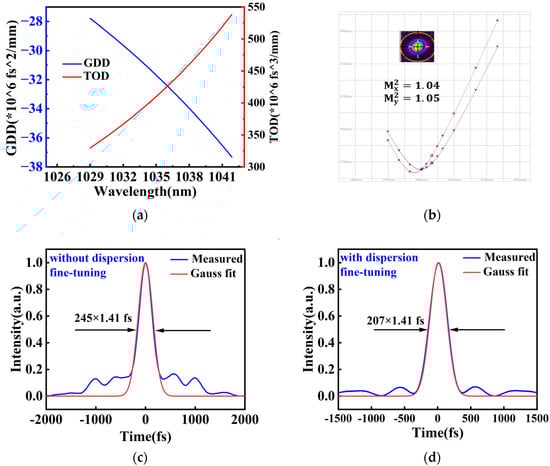 According to Equation (2), a conventional dual-grating compressor with a center wavelength of 1035 nm requires a propagation length of 30 cm to achieve GDD = −31.686 × 106 fs2 and TOD = 409.965 × 106 fs3, corresponding to D2 = 55.75 ps/nm and D3 = 1.1614 ps/nm2. The overall spectral dispersion curve is shown in Figure 5a. The total propagation distance for the single transmission grating configuration is 63.1 cm. Based on an optical design centered at 1035 nm, the distance from the grating to the first 45° mirror is 33.12 cm, the spacing between the two 45° mirrors is 3.7 cm, and the distance from the second 45° mirror to the grating is 26.28 cm. Special attention was paid during the design process to avoid beam truncation caused by the two 45° mirrors. Through carefully adjusting the vertical distance of the compression gratings, the duration of the amplified pulse could be compressed to 245 fs, assuming a Gaussian pulse envelope at the maximum output power, as shown in Figure 5c. By carefully adjusting the vertical spacing of the compression grating, the duration of the amplified pulse can be compressed to 245 fs, assuming a Gaussian pulse envelope at maximum output power, as shown in Figure 5c. However, uncompensated higher-order dispersion caused by nonlinear effects results in a pulse pedestal in the corresponding autocorrelation trace, indicating a significant degradation in pulse quality. This was partly addressed by finely tuning the dispersion provided by the TCFBG. When the pulse duration is reduced to 207 fs, the pulse pedestal disappears from the autocorrelation trace, as shown in Figure 5d. At a central wavelength of 1035 nm, the laser exhibited a FWHM spectral bandwidth of 9.5 nm, corresponding to a Fourier-transform-limited pulse duration of 166 fs, indicating residual effects from higher-order dispersion and nonlinear phase.
