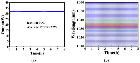 Monitoring was conducted for eight hours under stable operating conditions. As shown in Figure 6a, the root mean square (RMS) power fluctuation was only 0.25% at an output power of 32 W. A total of 33 sets of data were obtained by collecting spectral data every 15 min. The spectral stability plot (Figure 6b) exhibits a uniform banded structure with no observable fluctuations or diffusion phenomena. The system maintains all-fiber transmission throughout laser generation and amplification, ensuring high stability and providing excellent resistance to temperature variations and mechanical vibrations. These characteristics establish a solid foundation for long-term reliable operation in industrial, medical, and defense applications.