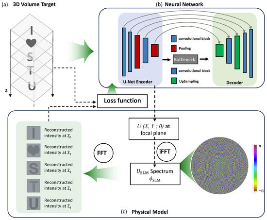As illustrated in Figure 2, our goal is to generate a 3D intensity stack comprising a set of distinct patterns [here exemplified by the text “I♡STU” shown in Figure 2a] distributed across multiple axial planes on both sides of the focal plane (). To achieve this target 3D intensity distribution, we employ a deep neural network built upon a U-Net-style encoder–decoder architecture. The network is designed to process a discretized representation of the 3D target volume, formatted as an input with size . Here, m denotes the lateral dimension of each 2D intensity pattern and p corresponds to the number of depth channels, each representing a specific axial plane within the defined 3D volume.