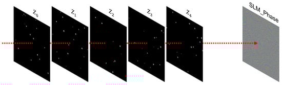 To train the network for multi-plane CGH, we first synthesize random sparse 3D point clouds and arrange them into binary intensity volumes distributed across five depth planes. Each point is randomly assigned to a specific plane and can be viewed as a diffraction-limited spot. An example of such a training sample is shown in Figure 3.