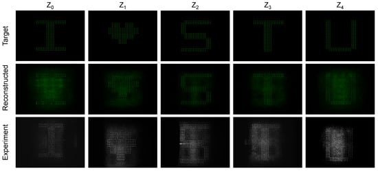 Multi-plane reconstruction of the “I♡STU” volume. Top: target intensity patterns at five planes. Middle: simulated reconstructions from a multi-plane CGH. Bottom: experimental camera captures.