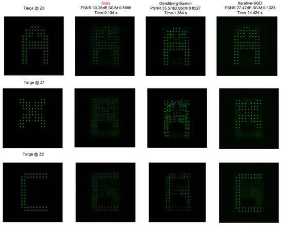 To further evaluate reconstruction performance on structured sparse patterns, we compare the proposed network with classical hologram generation approaches using multi-plane sparse targets, as shown in Figure 6. The targets consist of spatially separated binary point distributions located at different axial depths, which impose strict requirements on both depth selectivity and lateral localization accuracy. The proposed method reconstructs well-defined sparse patterns at the designated planes while maintaining minimal background leakage in non-target planes. In contrast, the GS method exhibits strong speckle-like background and depth defocus, causing partial activation of points at incorrect planes. The Iterative-SGD optimization improves energy concentration but still introduces intensity fluctuation and structural distortion due to local minima during optimization.