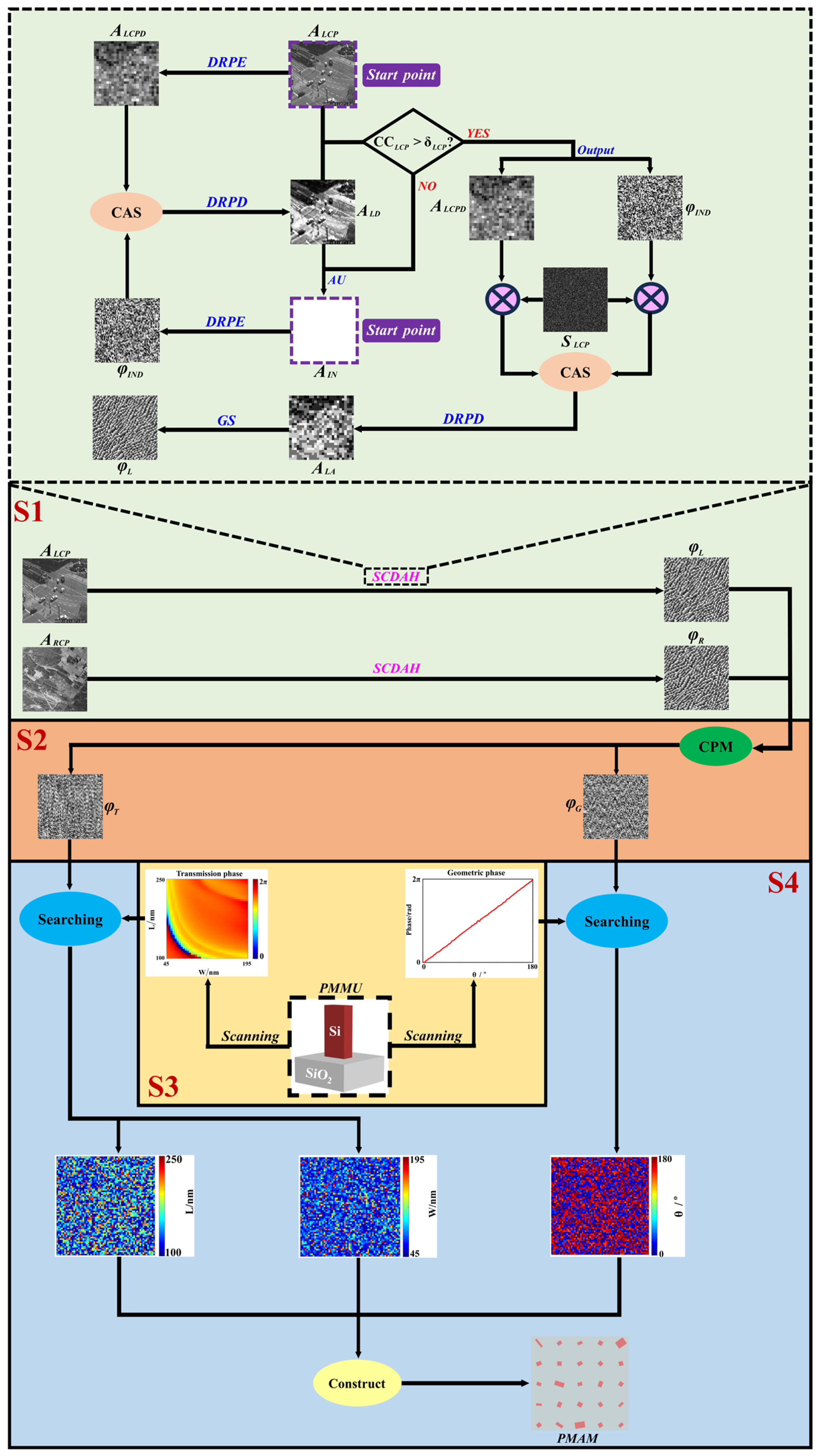 Figure 4f. In such a way, all structural parameters of each metasurface unit are determined, thereby enabling the construction of PMAM, which is displayed in