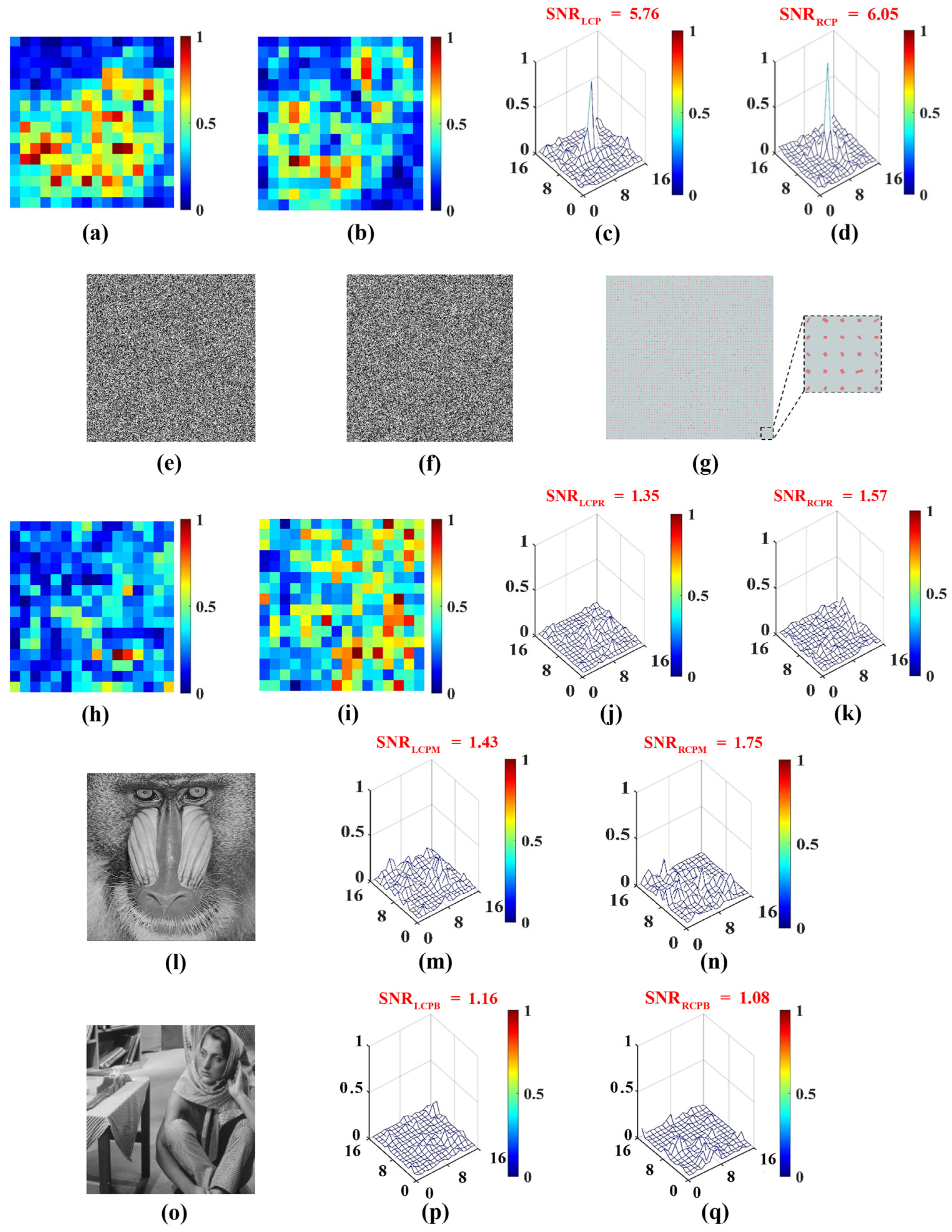 A collimated RCP light is used to illuminate this PMAM, and then the light wave, after phase modulation by the PMAM, begins to diffract forward. After the RCP background component in the diffracted light is filtered out, the LCP component in the diffracted light is obtained in the far field, and its amplitude information is recorded as the LCP channel diffraction image . Similarly, a collimated LCP light is also adopted to illuminate this PMAM, and then the light wave, after phase modulation by the PMAM, also begins to diffract forward. After the LCP background component in the diffracted light is filtered out, the RCP component in the diffracted light is obtained in the far field, and its amplitude information is recorded as the RCP channel diffraction image . Afterwards, the authentication step J2 is run.