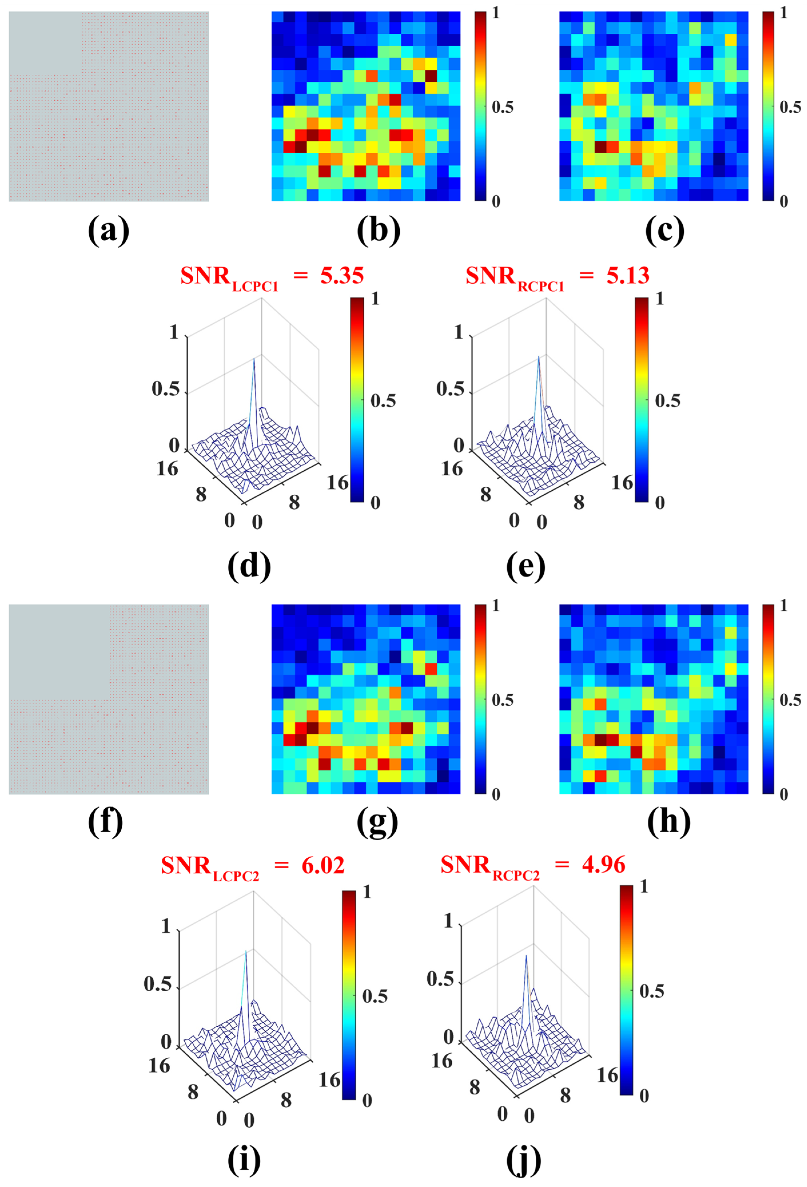 Figure 6, it can be clearly observed that obvious correlation peaks appear in all the nonlinear correlation distributions, even if the cropping ratio is as high as 25%, meanwhile the signal-to-noise calculated from each nonlinear correlation distribution is larger than corresponding preset threshold. This indicates that the cropped PMAM can still be effectively authenticated with dual-channel plaintext images, thus demonstrating that the PMAM possesses strong robustness against cropping attack.