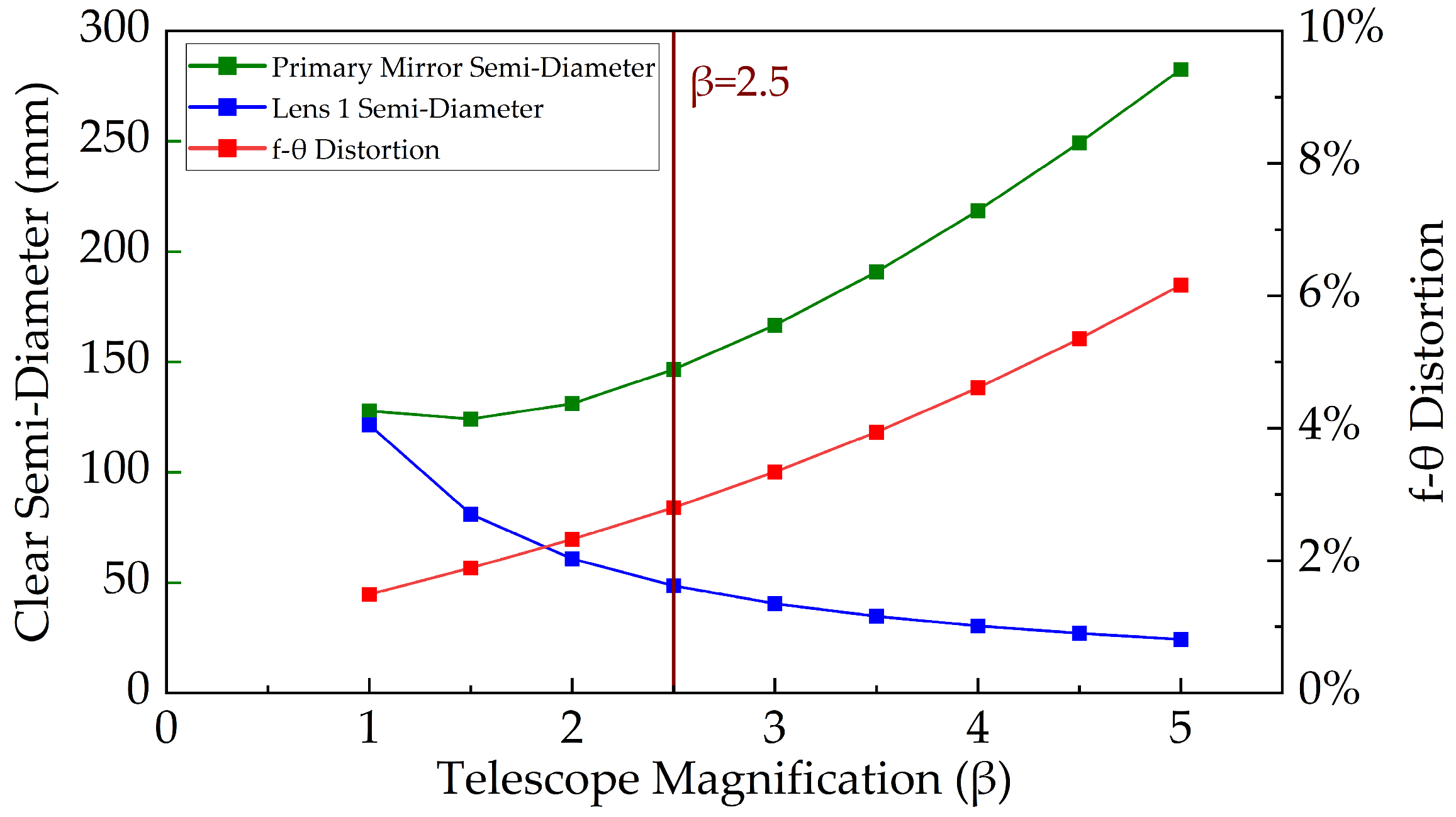 Comparison indicates that a magnification of 2.5 balances the semi-diameters of the primary mirror and the first lens. This setting minimizes