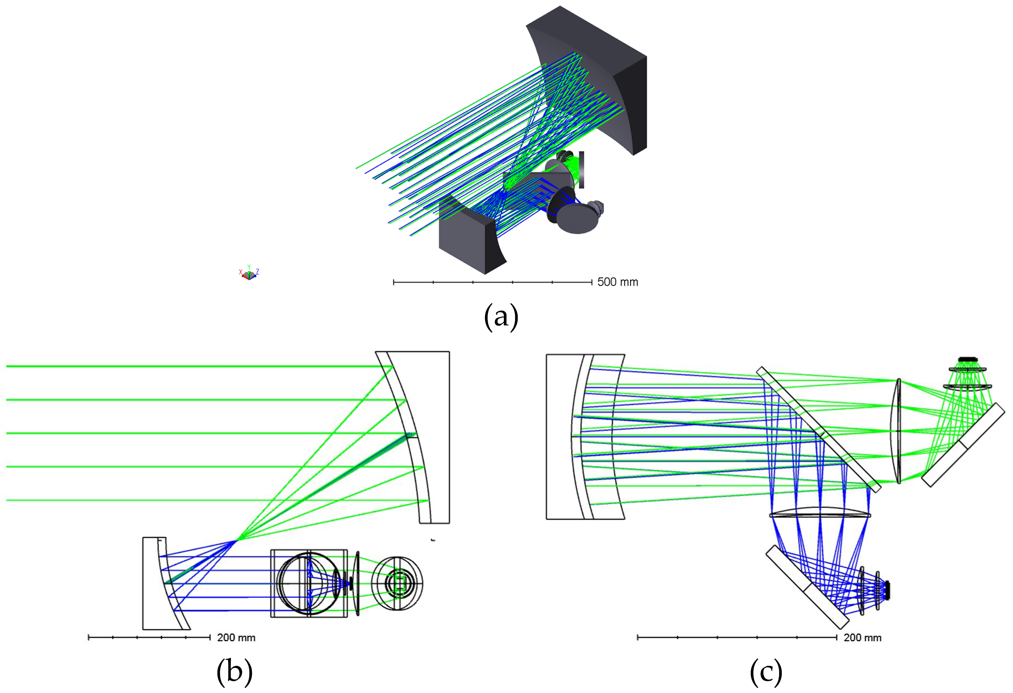 In summary, this system adopts a multispectral imaging scheme comprising a common aperture telescope, channel separation via a dichroic mirror, integrated filter arrays, and image motion compensation using an FSM. The optical design specifications for this system are presented in