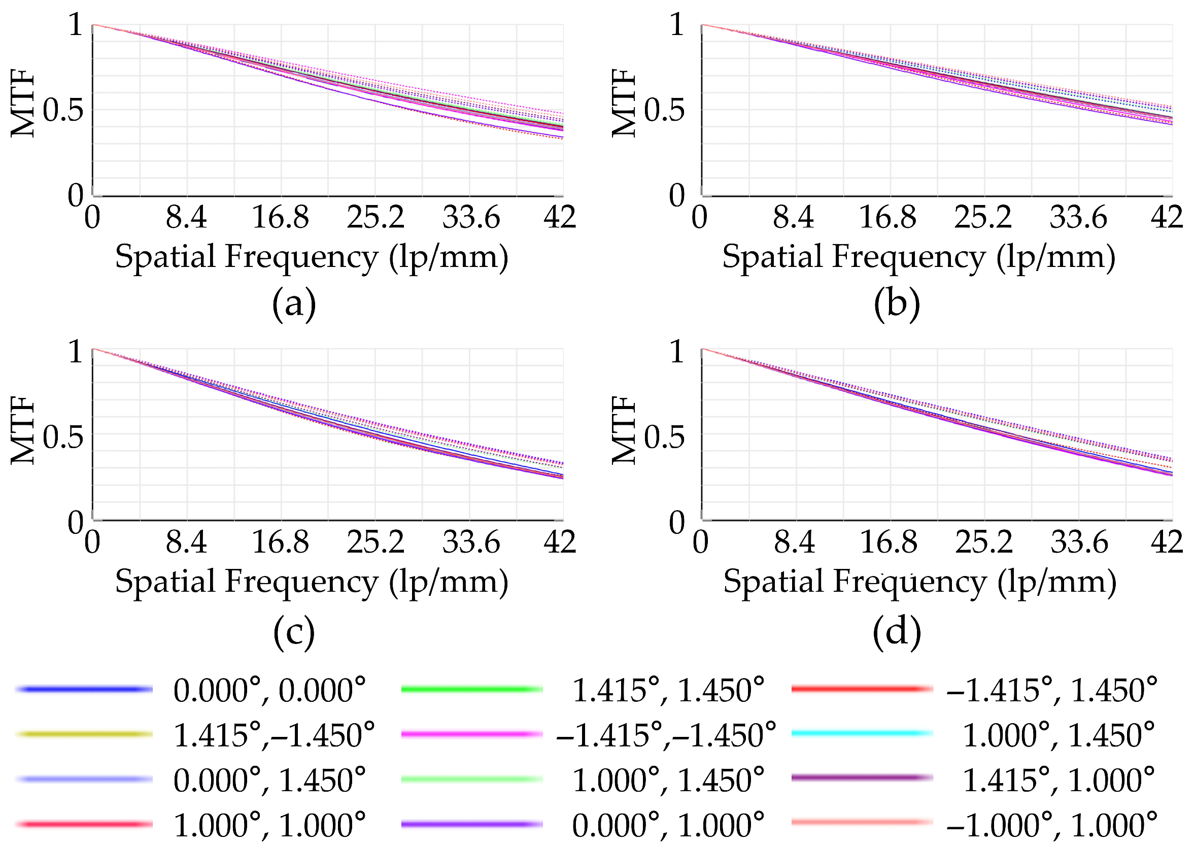Figure 7 shows the simulated imaging results. These figures demonstrate that the designed MTF values for all channels across the full FOV are at least 0.2. Consequently, the imaging clarity is high and satisfies the system’s requirement for an MTF of 0.1 or greater.