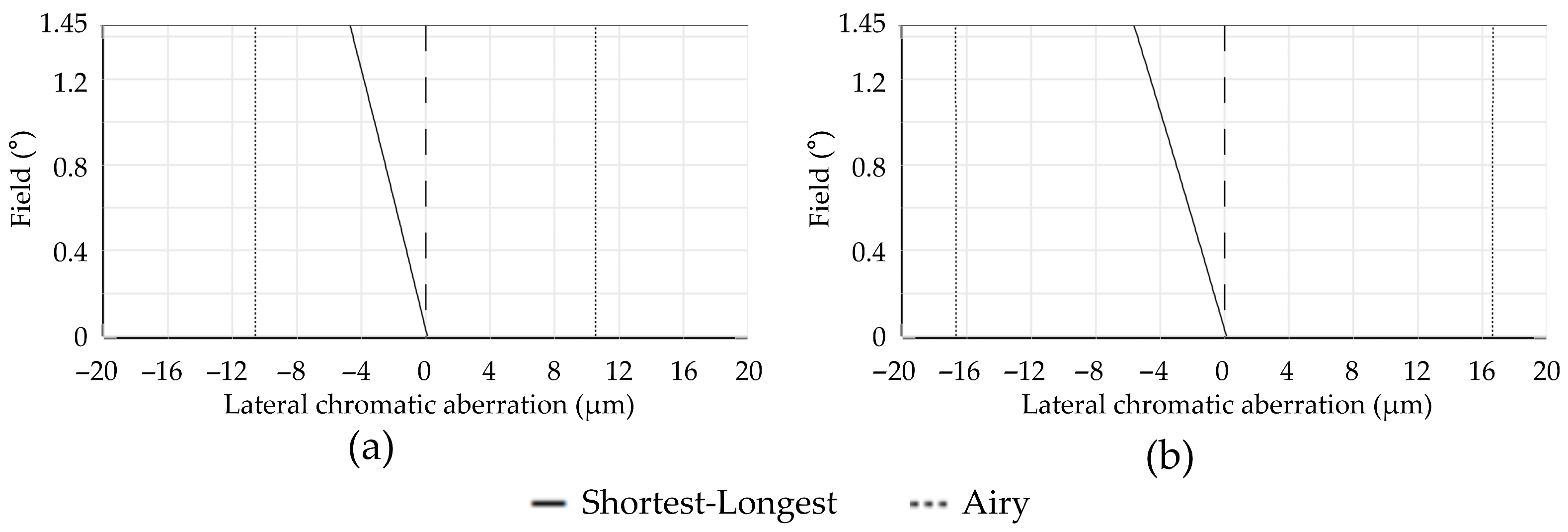 For the optimized optical system, the wide spectral range makes lateral chromatic aberration, field curvature, and distortion the primary off-axis aberrations. The design results for lateral chromatic aberration are presented in