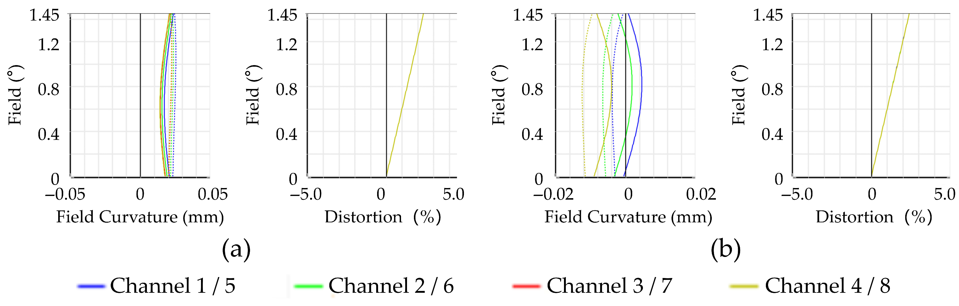 Figure 9 show that the maximum residual lateral chromatic aberration for all channels is smaller than the Airy disk radius. The tangential and sagittal field curvatures for all channels are below 0.03 mm. The system employs push-broom scanning and an FSM for image motion compensation, which requires a linear relationship between image height and FOV angle to ensure consistent cross-track pixel dwell time. Compared with
