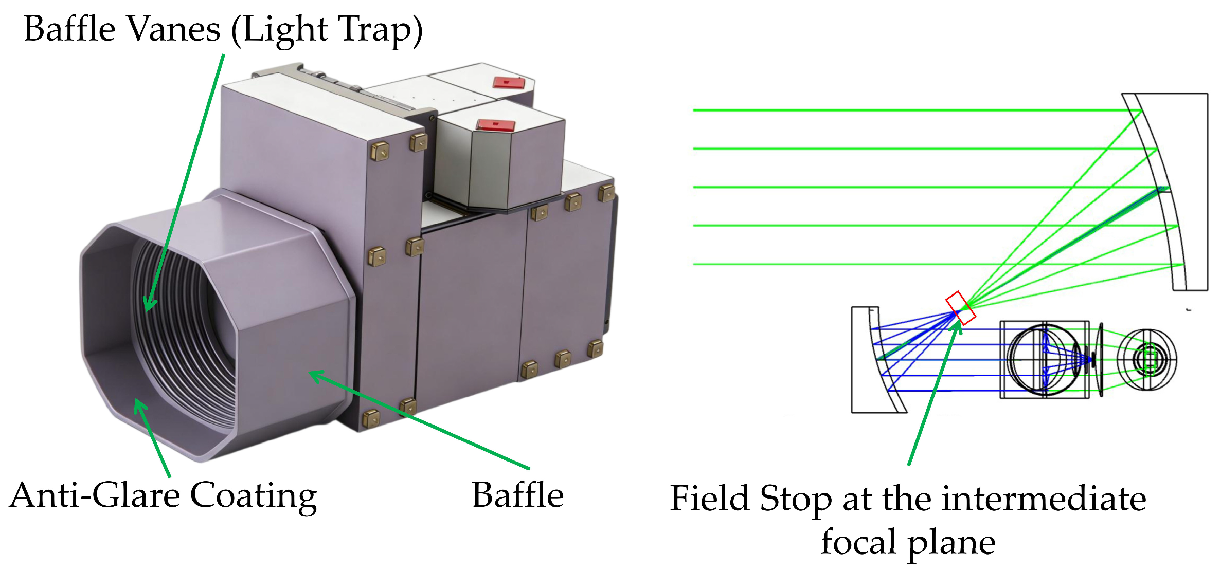 - Chen, S.; Niu, X. Analysis and Suppression Design of Stray Light Pollution in a Spectral Imager Loaded on a Polar-Orbiting Satellite. Sensors 2023, 23, 7625. [Google Scholar] [CrossRef] [PubMed]
