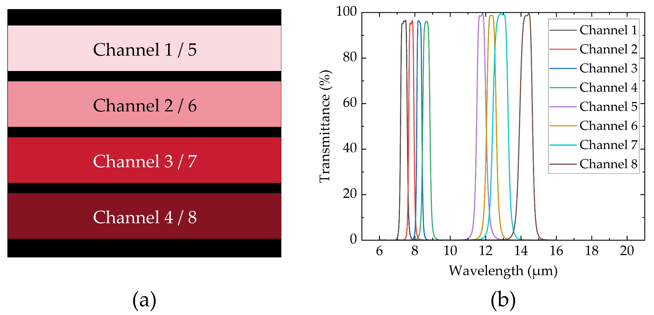 - Li, X.; Yuan, L.; Li, C.; Liu, X.; Guo, B.; Lu, J.; Liu, S.; He, Z. Aperture-Coded Long-Wave Infrared Hyperspectral Imager With Noncryogenic Optomechanical System. IEEE Trans. Instrum. Meas. 2025, 74, 4511809. [Google Scholar] [CrossRef]