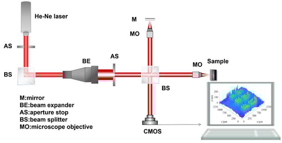 To rigorously validate the effectiveness of this simulation system, we constructed a DHM experimental setup based on a Michelson interferometer (see Figure 3 for the schematic diagram of the optical system) and performed measurements on the USAF 1951 resolution test target in a transparent medium. The experimental system uses a Daheng DH-HN250 He-Ne laser (China Daheng Group, Inc., Beijing, China) as the light source. Its operating mode is TEM00, the wavelength is 632.8 nm, the beam diameter is <0.7 mm, and the laser power is 12.0 mW. The objective lens is a critical component for system imaging, and its parameters and quality directly affect the imaging resolution and clarity. The parameters primarily considered here that influence imaging quality are focal length, magnification, and numerical aperture. The focal length is the distance from the objective’s optical center to the focal point when the light is parallel to the incident; magnification is the ratio of the image size to the corresponding object size during imaging; and the numerical aperture (NA) describes the angular range of light that the objective can collect and determines the objective’s spatial resolution. Based on experimental requirements for magnification, resolution, etc., the parameters of the selected microscope objective are as follows: NA = 0.25, magnification = 10×, working distance (WD) = 10.6 mm, focal length = 18 mm, and objective field number (OFN) = 22 mm. In digital holography, CCD or CMOS cameras are commonly used to record holograms. The digital camera used in this system is the OMRON STC-MCS1242POE, with the following main parameters: photosensitive area size of 10.35 mm × 14.13 mm, resolution of 3000 × 4096, pixel size of 3.45 3.45 , and applicable spectral range of 400 nm–900 nm.