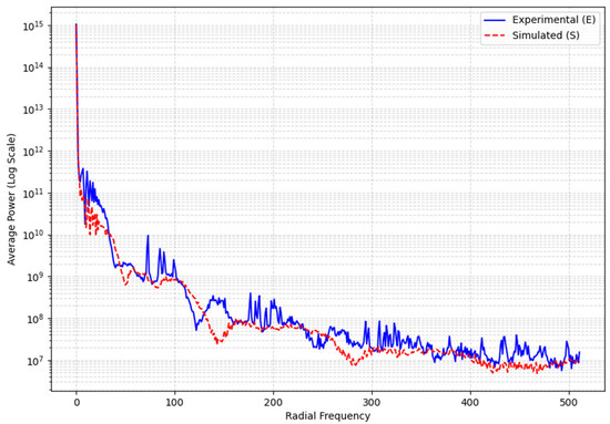 For a precise quantitative comparison, we further computed the Radially Averaged PSD. This metric integrates the 2D spectral power radially, revealing the average power distribution across spatial frequencies. As depicted in Figure 6, the experimental (E) curve and the simulated (S) curve show a nearly perfect match. This confirms two key points: Our simulation accurately reproduces the dominant spatial frequencies of the parasitic fringes, visible as the primary peaks in the curves. The decay trends of both curves are highly consistent across the entire high-frequency range, validating the accurate characterization of the speckle noise statistics.