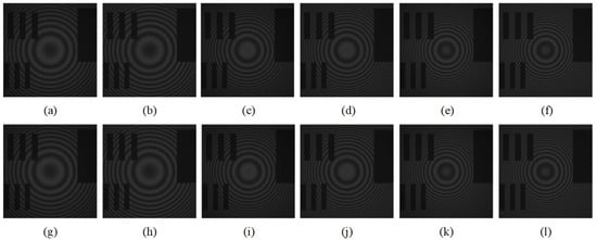 Our simulation system enhances model generalization by generating diverse, coherent noise. This is achieved by adjusting the parasitic fringe density and contrast, and by controlling the spatial distribution of speckle noise. To ensure the diversity of the generated simulation data, three core physical parameters in the simulation system are set to vary randomly within specific ranges, with the specific parameter ranges shown in Table 1: the medium thickness is used to control the spatial frequency of parasitic fringes; the propagation distance is perturbed within a certain range to introduce defocus effects; and the variation in the angle between the object and reference beams is used to adjust the signal fringe density. The partial simulation data is shown in Figure 7. To clarify the effect of different parameter values on coherent noise patterns, Figure 7 is arranged in a controlled comparison layout: images (a)–(f) correspond to = 0.06 rad and (g)–(l) correspond to = 0.08 rad, where θ denotes the off-axis angle θ. Within each row, (a, b), (c, d), and (e, f) form three paired comparisons with = 0.008, 0.012, and 0.016 m, respectively, and only varies between 0.090 and 0.095 m within each pair.