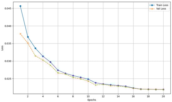 We chose the synthetic data as the training data for network training. For the synthetic noise-removal task, a simulated dataset of 500 high-resolution holograms is used. To construct the noise-clean training image pairs, 400 images are randomly selected for the training dataset, and the remaining 100 images serve as the test set. To ensure adequate training and optimize computational efficiency, we crop high-resolution holograms into 64 × 64 patches and set the batch size to 32. The MAENet is trained with the ADAM [26] optimizer using β1 = 0.9, β2 = 0.999, and ε = 10−8. The learning rate is initially set to 1 × 10−4 and is halved every five epochs. We monitored the training and validation losses and observed that the validation loss stabilized around the 17th epoch, suggesting that 20 epochs are sufficient for the model to fully converge. The convergence curve during model training is shown in Figure 8.