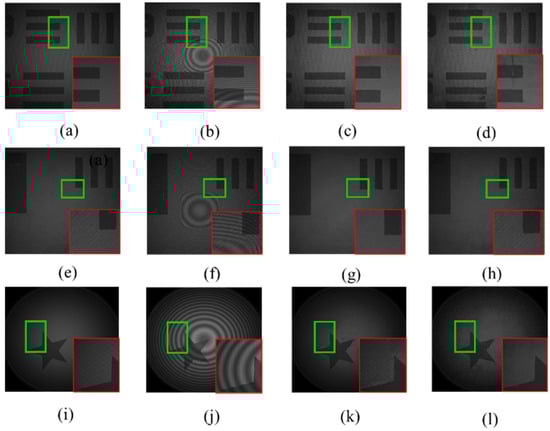 Figure 11 presents a qualitative comparison of denoising performance between the U-Net and our proposed MAENet. To strictly evaluate the model’s robustness under varying optical conditions, we selected three distinct regions of the USAF 1951 resolution test target (Figure 11a–c). Notably, these figures are arranged in ascending order of interference fringe density. This increase in density is directly attributed to the progressively larger angle between the object and reference beams, effectively simulating a range of different optical operating conditions. The original noisy holograms are heavily corrupted by the coherent noise, characterized by distinct ring-like parasitic fringes and severe speckle noise, which significantly impacts image reconstruction.