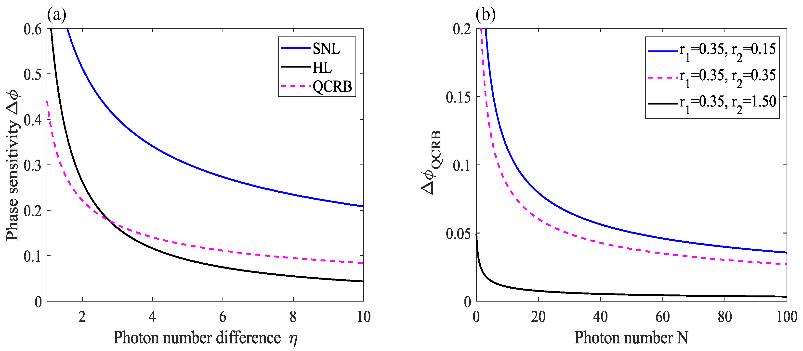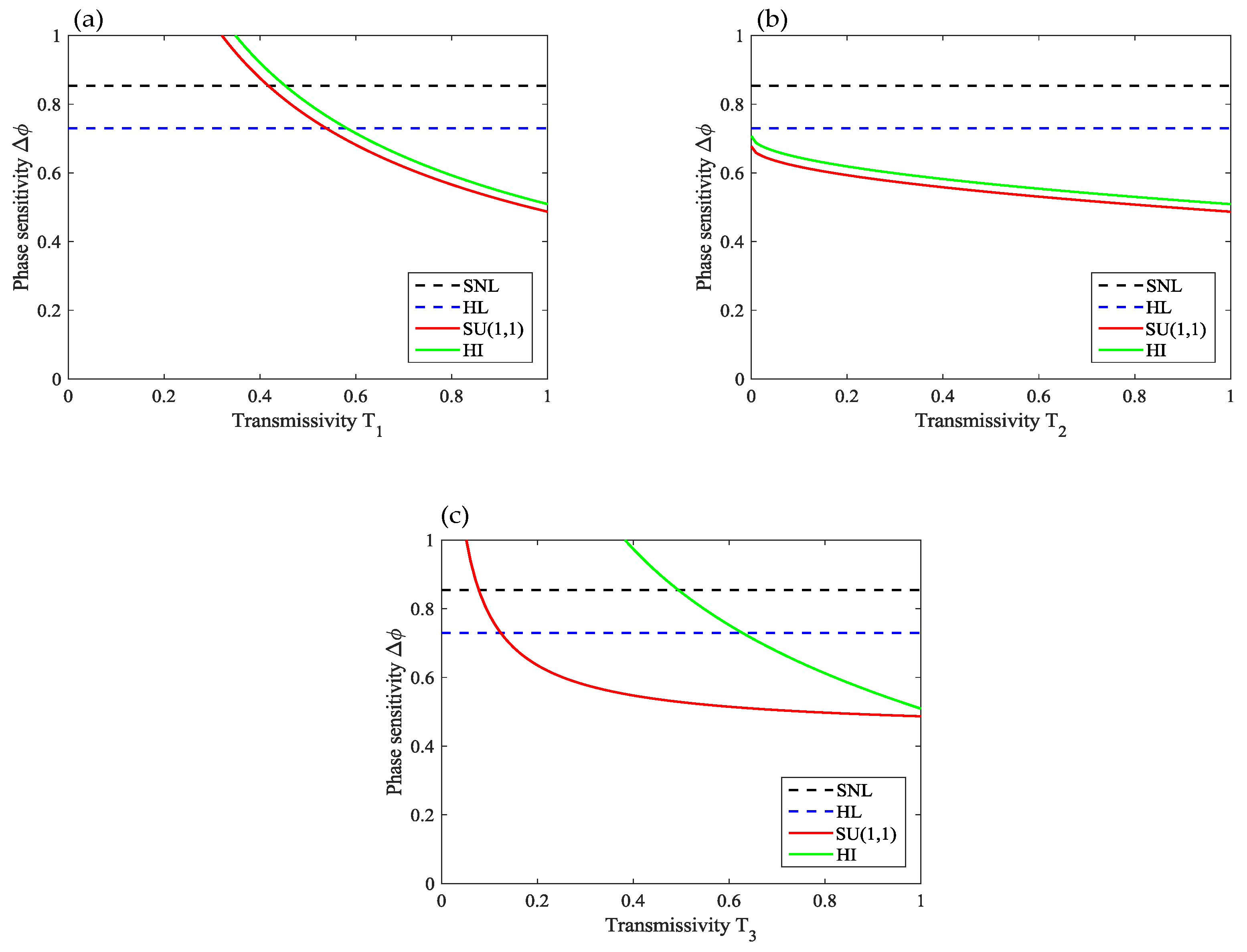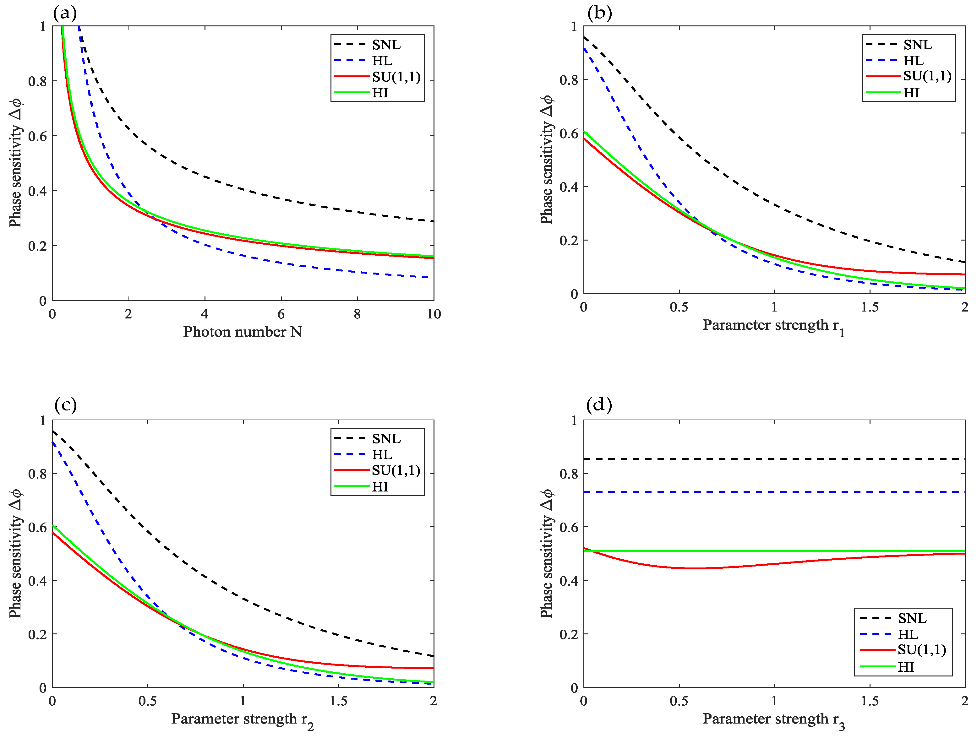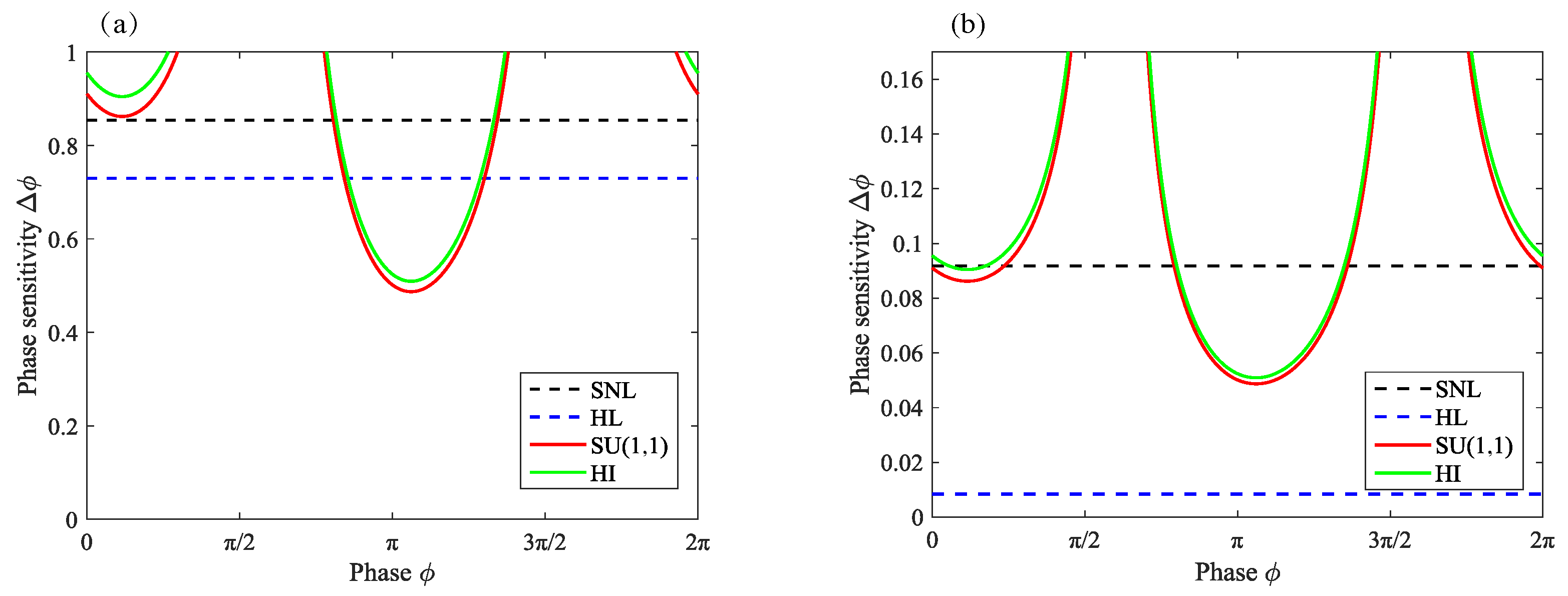Figure 11a, as the photon number increases, the phase sensitivities based on the HI and SU(1,1) interferometer are further enhanced. In the low-photon-number regime, both schemes can surpass the HL. And the phase sensitivity based on the SU(1,1) interferometer is always better than that of the HI. In