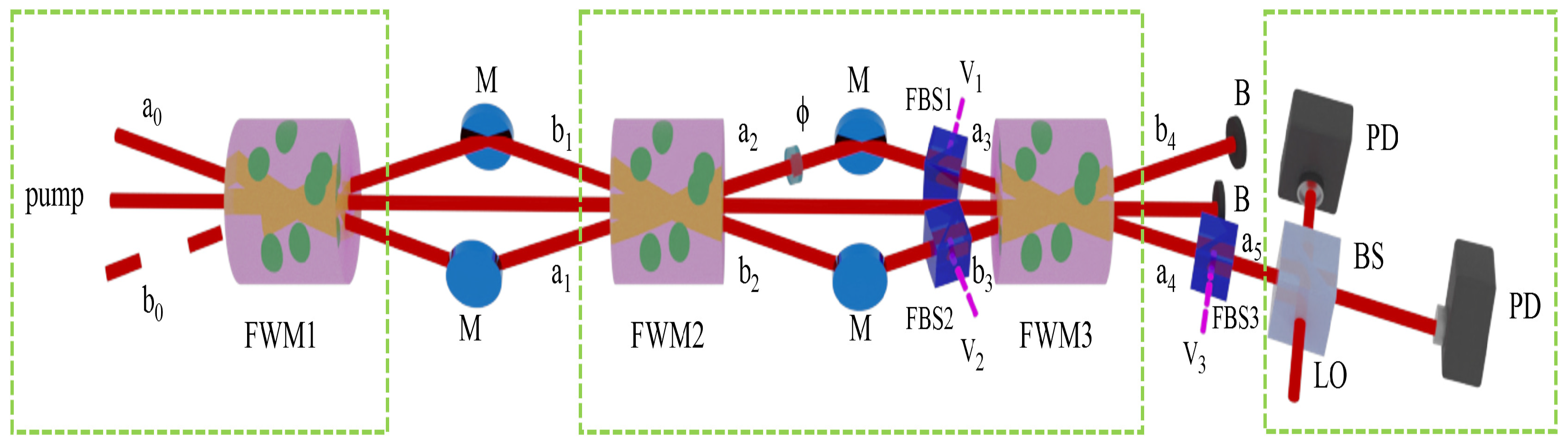 Figure 1, which contains three FWMs and a phase shifter. A coherent beam and a vacuum beam enter the FWM1, which is used to generate a two-mode squeezed coherent state. It is a phase insensitive process [