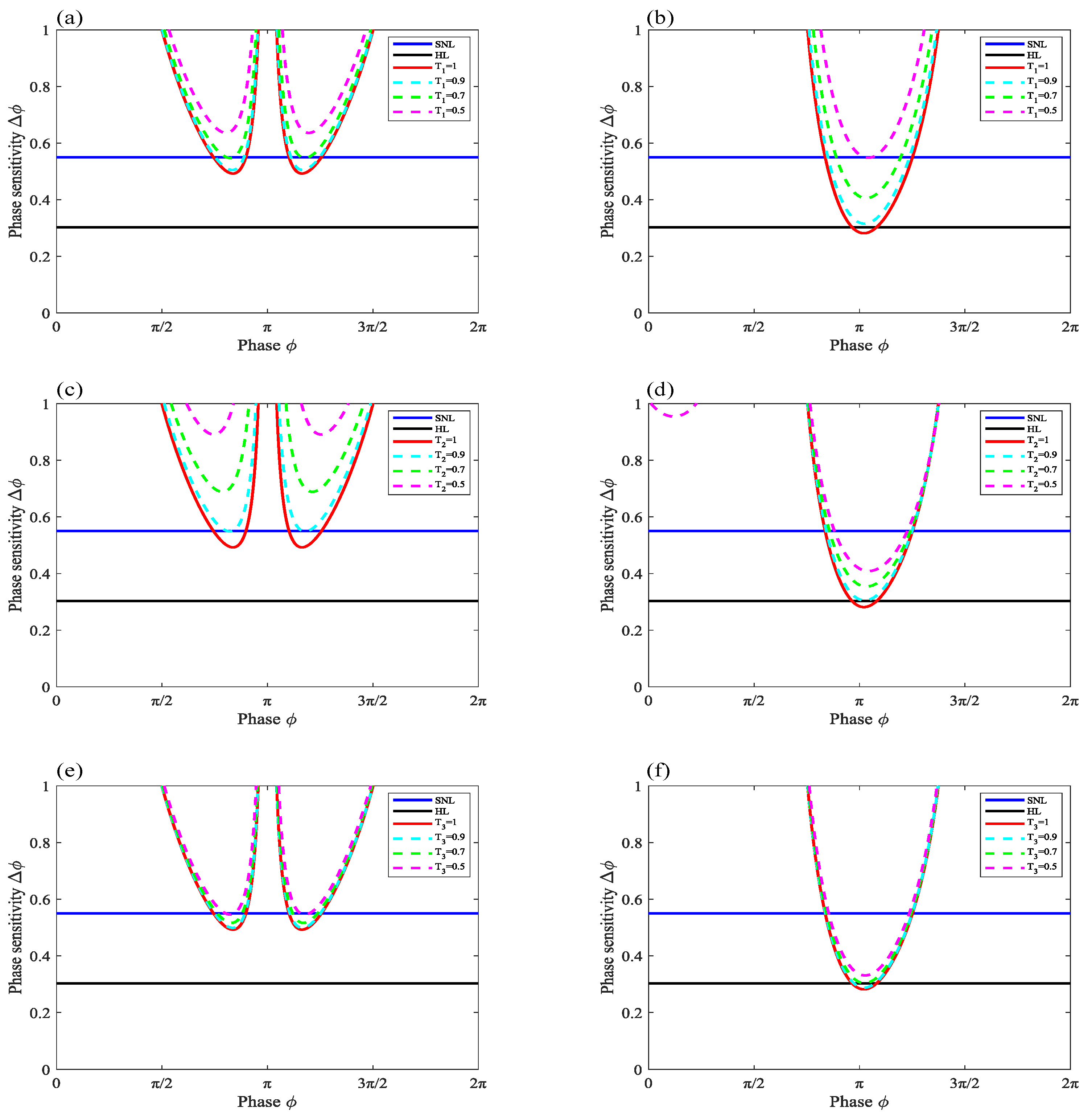 Figure 6b,d,f show the phase sensitivity via BHD. Without the loss, the optimal phase sensitivity can reach the sub-HL. In