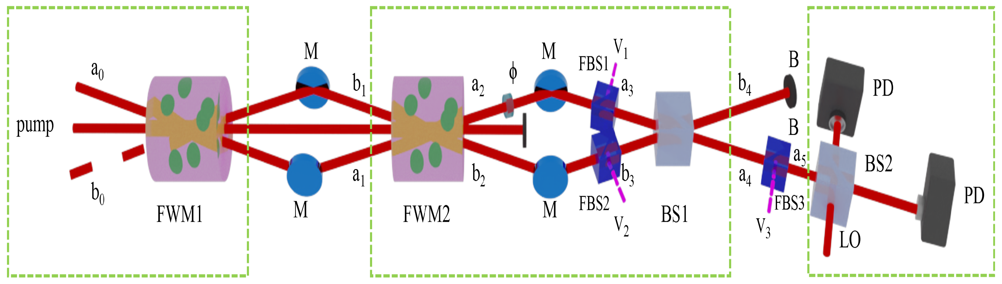 34]. Then, the two output beams are injected into the SU(1,1) interferometer, which consists of the FWM2 and the FWM3. Without the FWM1 process, this structure of an SU(1,1) interferometer will reduce to an ordinary SU(1,1) interferometer, which was experimentally realized in 2011 [