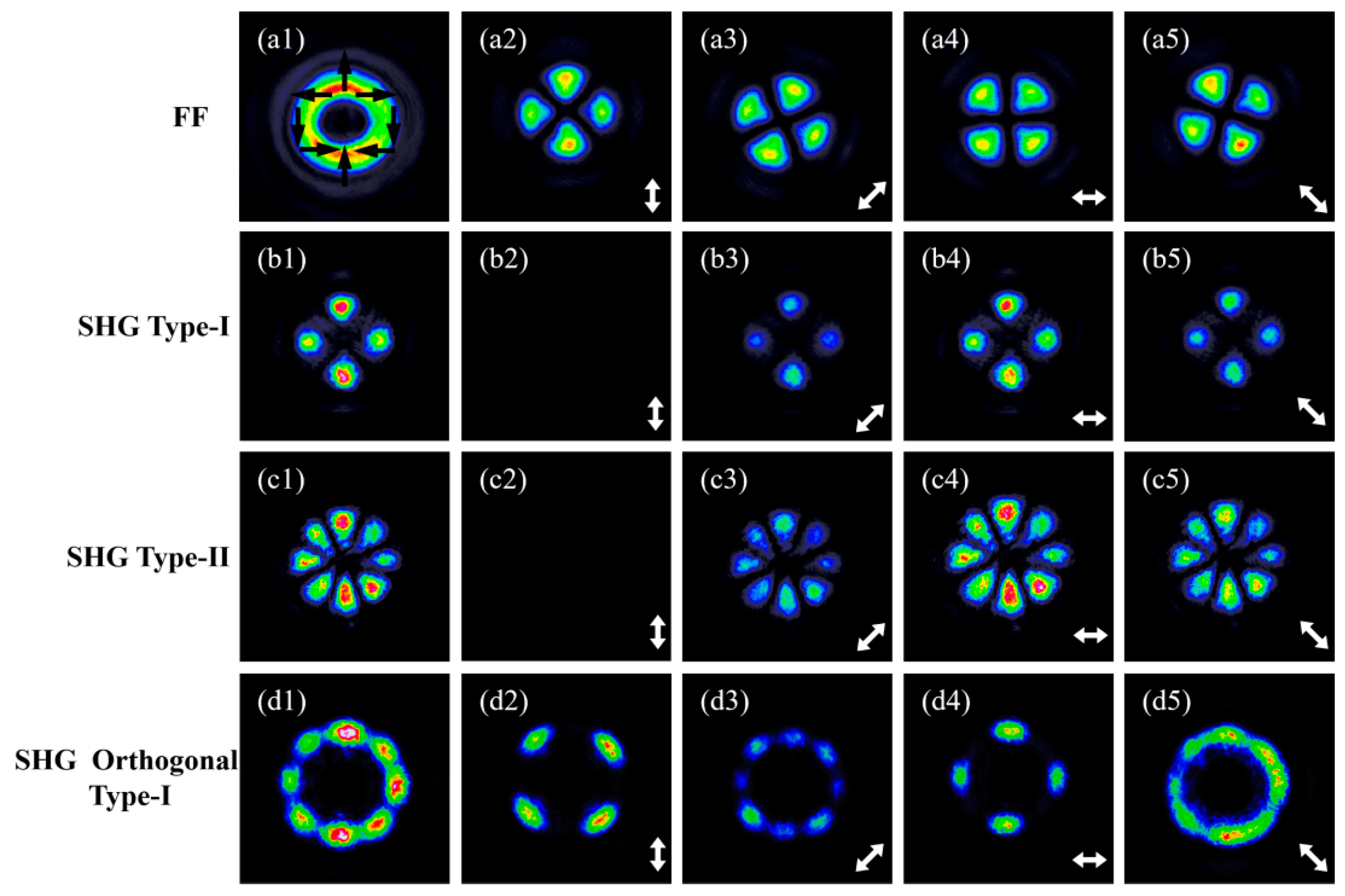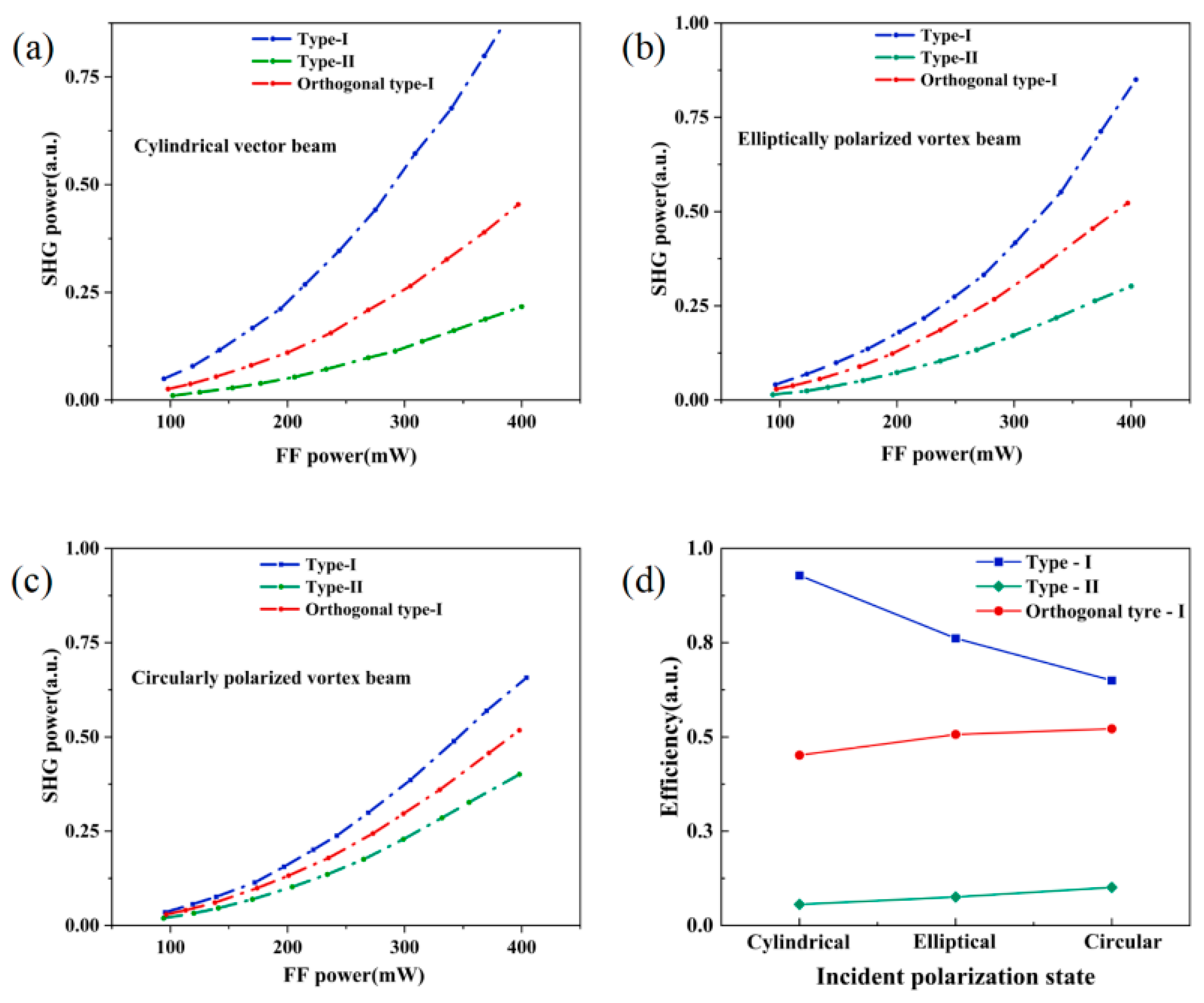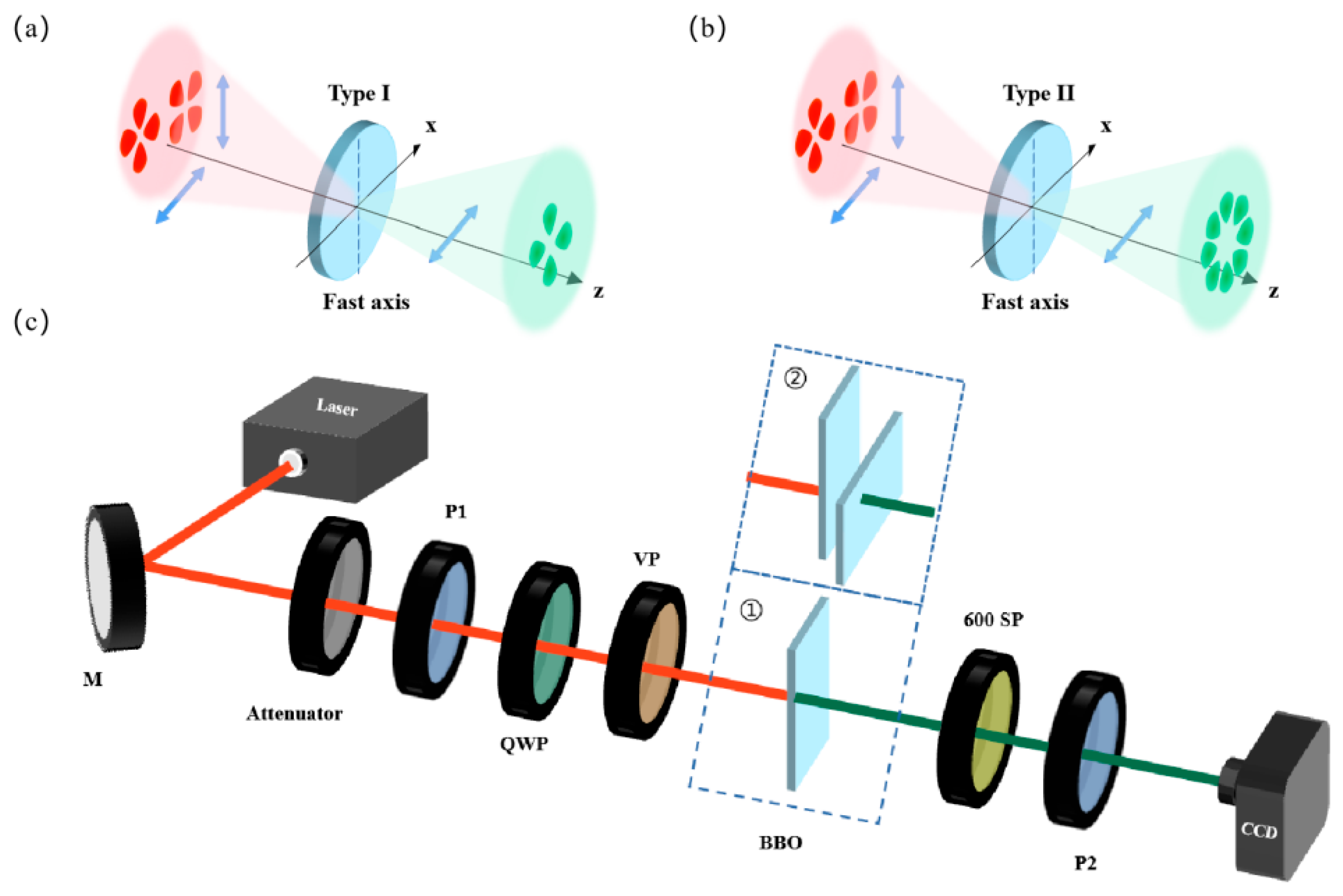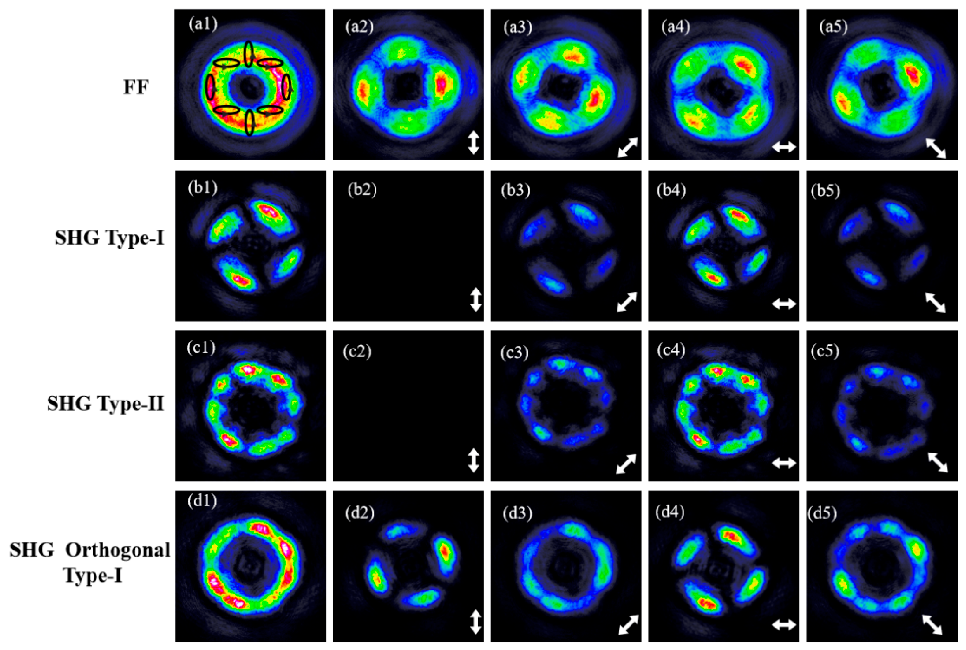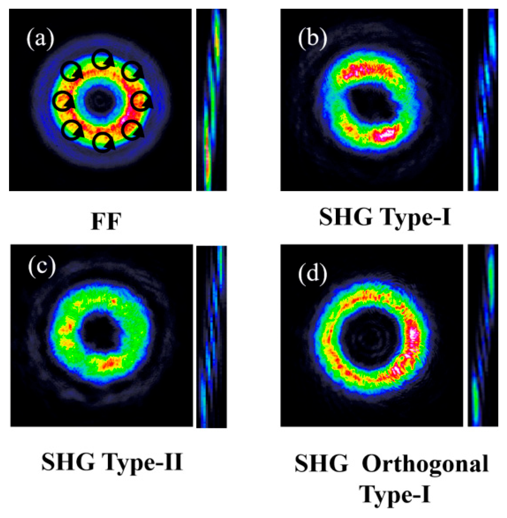 - Wu, H.J.; Yang, H.R.; Rosales-Guzmán, C.; Gao, W.; Shi, B.S.; Zhu, Z.H. Vectorial nonlinear optics: Type-II second-harmonic generation driven by spin-orbit-coupled fields. Phys. Rev. A 2019, 100, 053840. [Google Scholar] [CrossRef]