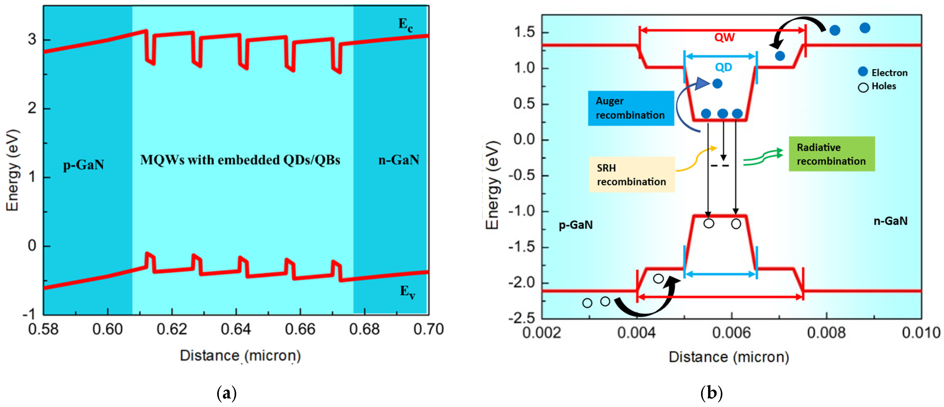 - Xia, C.; Hu, W.D.; Wang, C.; Li, Z.F.; Chen, X.S.; Lu, W.; Li, Z.M.S.; Li, Z.Q. Simulation of InGaN/GaN multiple quantum well light-emitting diodes with quantum dot model for electrical and optical effects. Opt. Quantum Electron. 2006, 38, 1077–1089. [Google Scholar] [CrossRef]