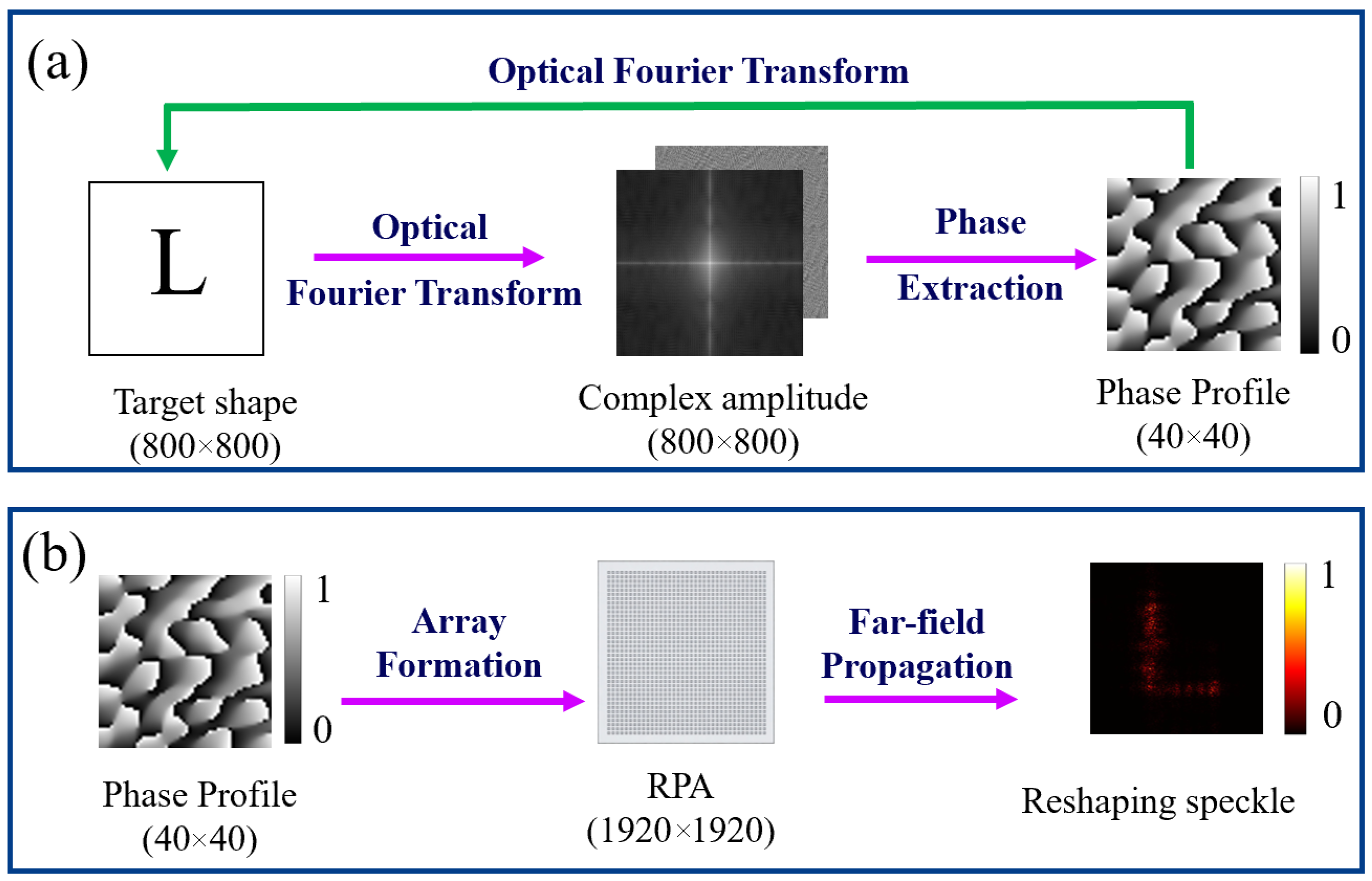 Figure 1a, each phase profile is periodically replicated and combined with independent random phase modulation to construct the corresponding RPA. The fabricated RPA is then illuminated by a collimated plane wave, and the resulting reshaped speckle patterns are recorded.