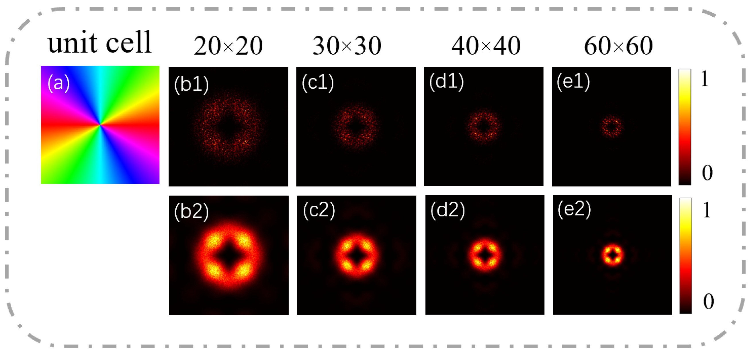 Figure 4(b2–e2). The simulation results clearly demonstrate that increasing the unit-cell size leads to a systematic reduction in the overall spatial scale of the far-field speckle pattern. This behavior is fully consistent with the theoretical analysis based on the Fourier scaling property, thereby confirming the effectiveness of unit-cell size as a key parameter for controlling speckle statistics in the proposed RPA framework.
