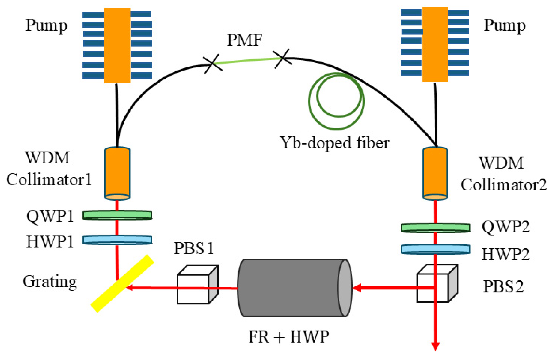 Figure 1, the configuration of the solid-state fiber laser incorporates a fiber component and a free-space component. The fiber component consists of a 55 cm-long Yb-doped fiber as the gain fiber (Coractive-Yb-550, CorActive High-Tech, Québec City, Canada), a 13.2 cm-long polarization-maintaining fiber (PMF), and two Wavelength Division Multiplexing (WDM) collimators. The gain fiber has a core diameter of 4 μm with an absorption coefficient of ~1750 dB/m at 976 nm. Both ends of the gain fiber are integrated into the WDM collimators to minimize the length of the laser cavity. The WDM collimators have a coupling loss of ~1 dB. Two 900 mW 976 nm pump lasers are coupled into both ends of the gain fiber through WDM collimators. Bidirectional pumping is adopted to increase the intracavity energy. An isolator is employed after each pump laser, thereby preventing damage to the pump lasers from back reflections. The transmission grating (IBSEN, Farum, Denmark, 1250 lines/mm, polarization-dependent) employed in the setup exhibits a diffraction efficiency exceeding 90% across the 1000–1100 nm operating band.
