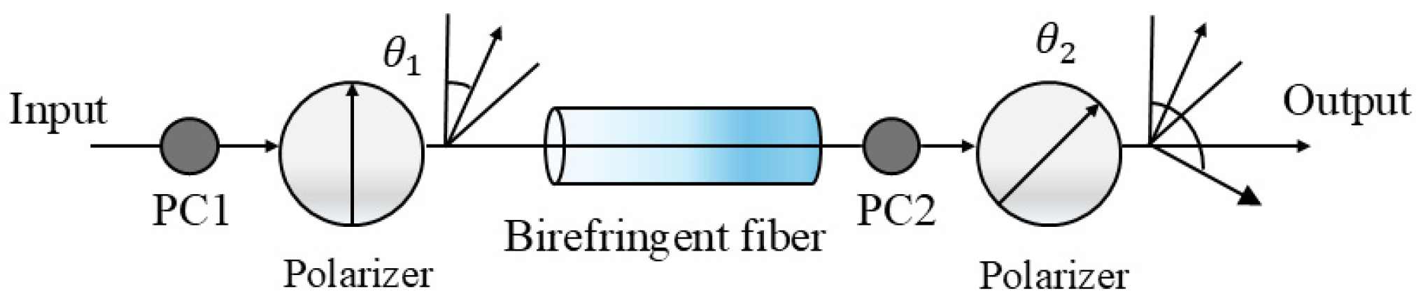 represents the phase delay induced by the birefringent polarization-maintaining fiber, where is the fiber length, is the birefringence coefficient, and is the wavelength.