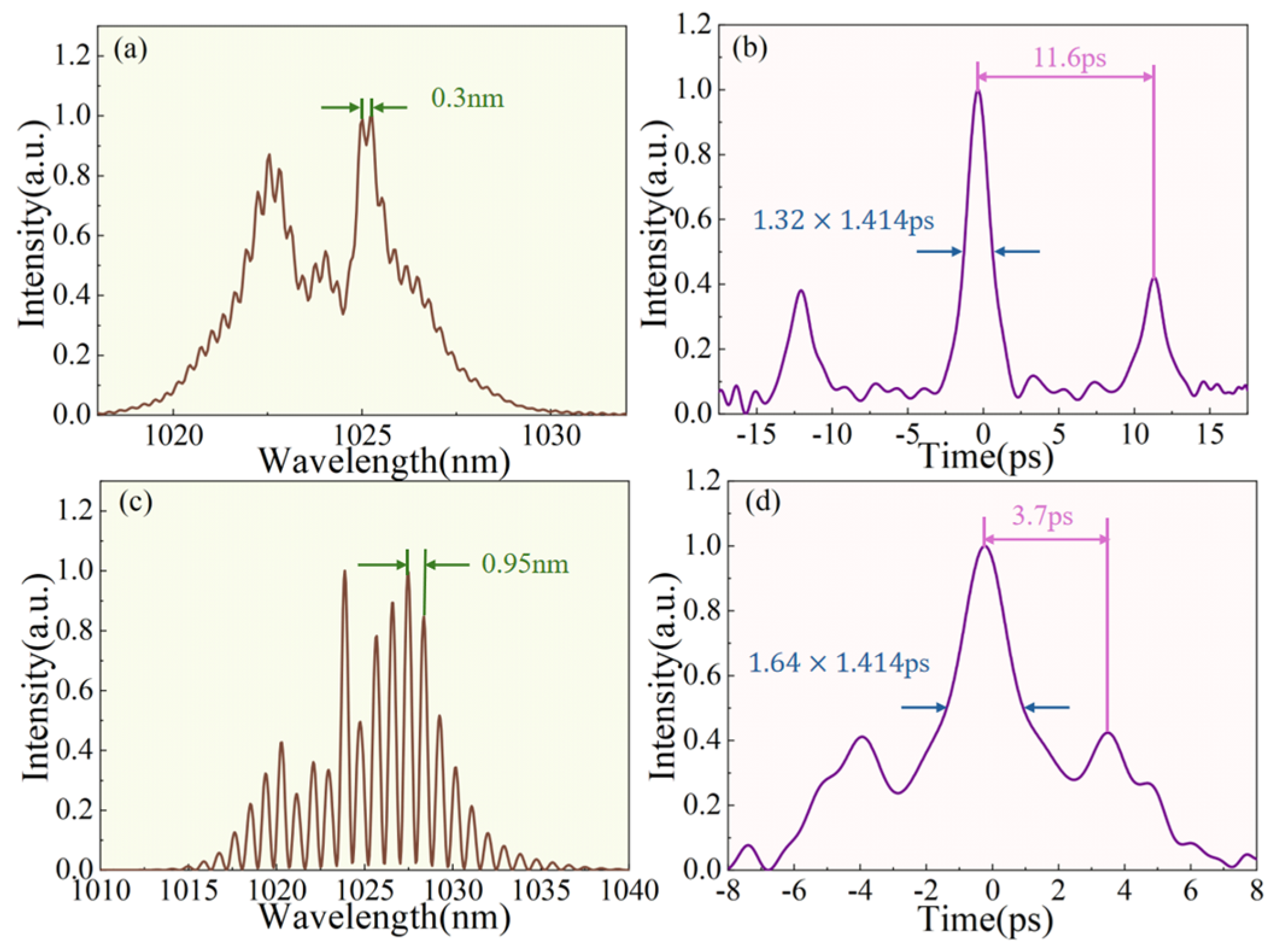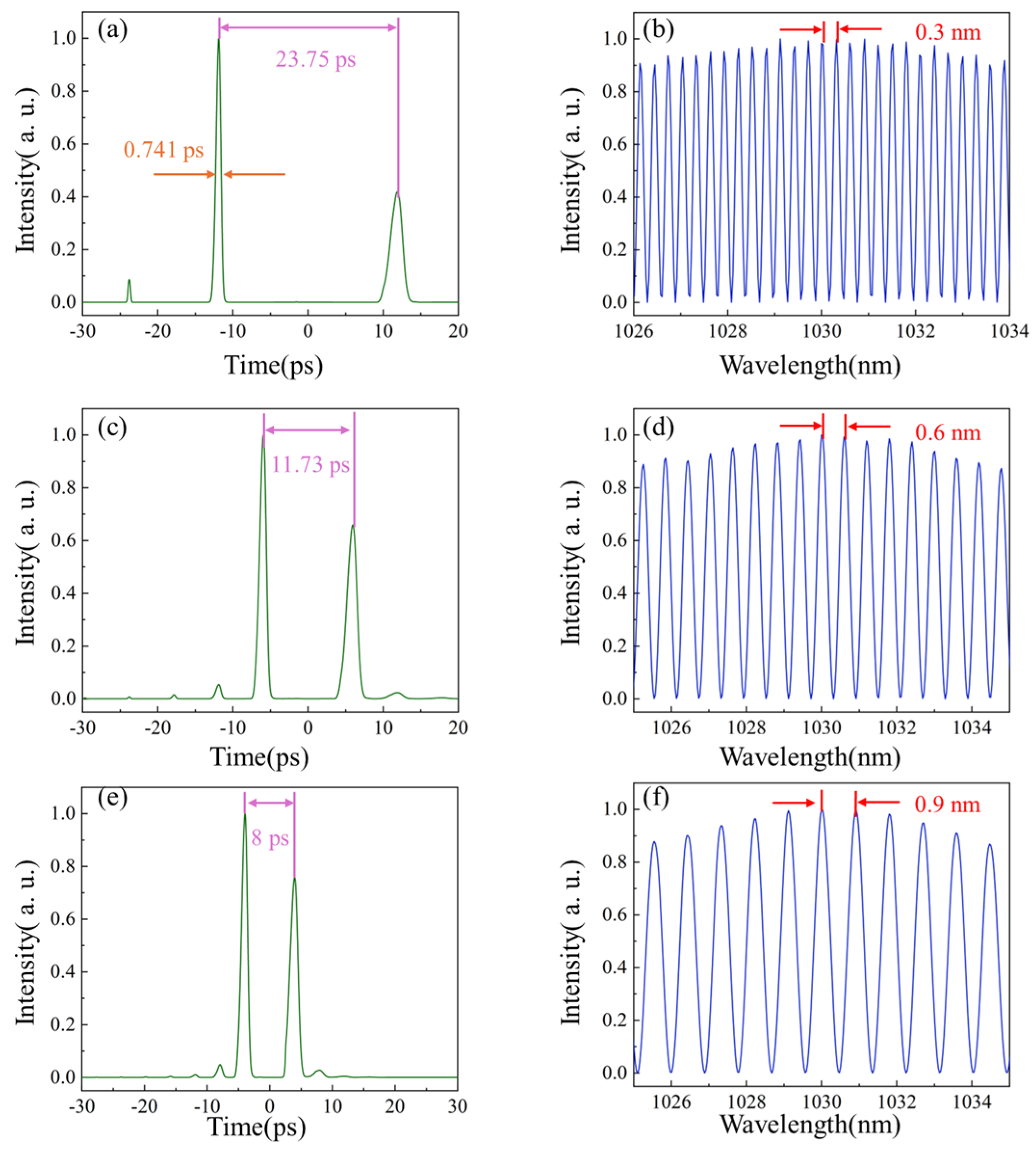 Figure 5c, corresponding to a pulse separation of 3.7 ps in the autocorrelation trace. This 3.7 ps separation is approximately 2.3 times the pulse duration (1.64 ps), indicating a tightly bound soliton state. Such solitons typically form under stronger interactions, leading to reduced inter-soliton distances and enhanced stability during soliton evolution. Unlike loosely bound solitons, tightly bound states maintain fixed discrete pulse separations that remain robust against external perturbations [