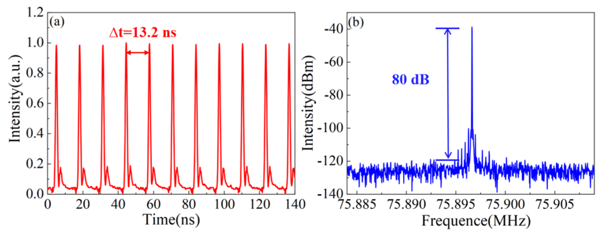 Figure 4a, the pulse train of the output soliton molecules was recorded by a 2.5 GHz photodetector and a 4 GHz oscilloscope, with a time interval of 13.2 ns. Mode locking was achieved at 0.35 W pump power. The fundamental repetition rate of the soliton molecules was measured to be 75.8 MHz in