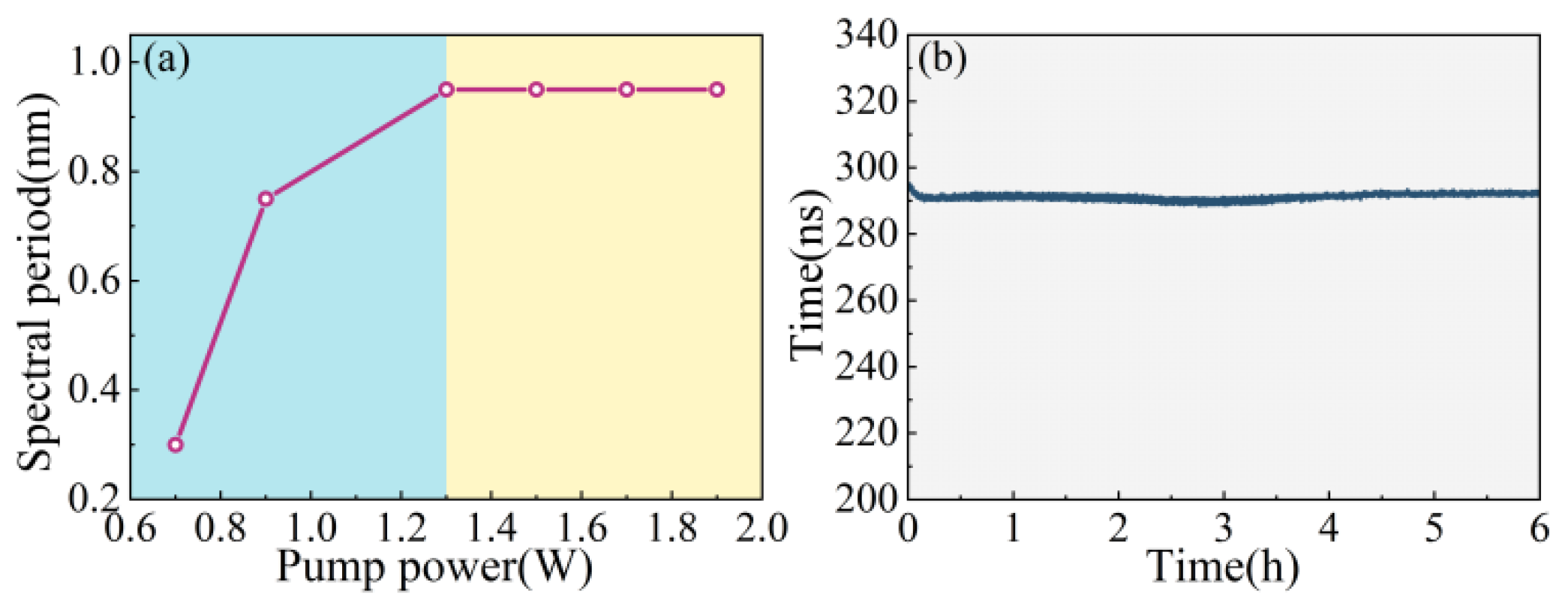 When the pump power was beyond 1.3 W, the spectral fringe spacing stabilized at 0.95 nm because the nonlinear effects saturated, establishing a sustained balance between dispersion and nonlinearity, as shown in