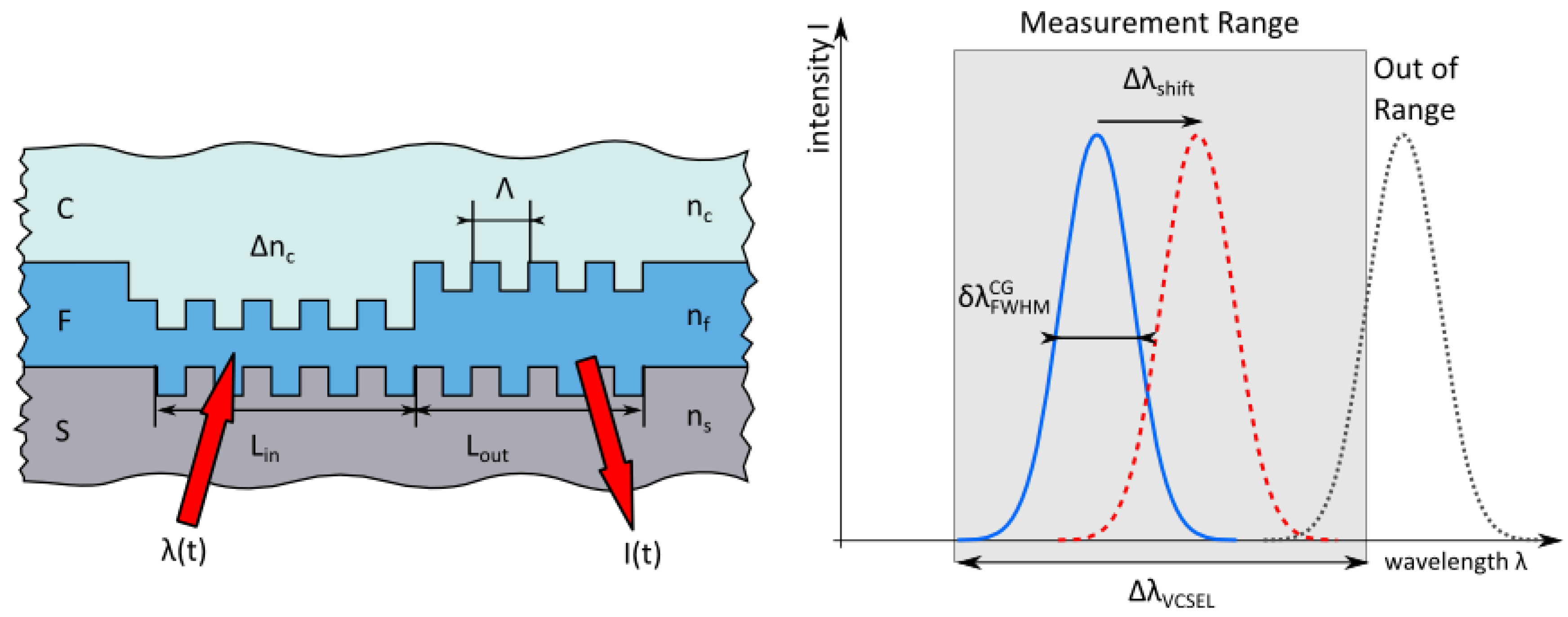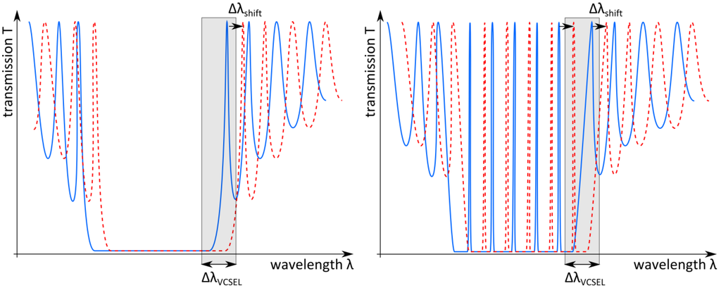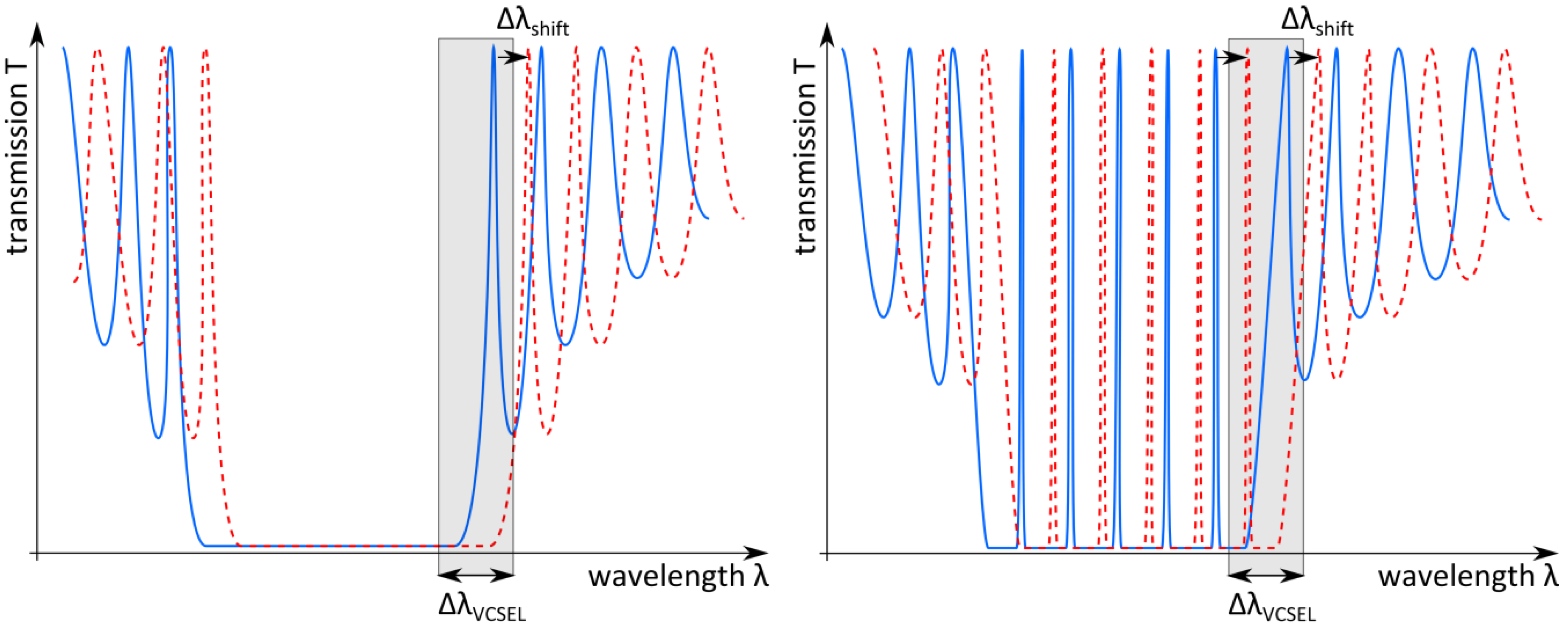The additional resonance peaks within the stop-band help to bridge the 2 nm tuning range of the VCSEL laser ∆λVCSEL increase the transducers dynamic range and ease the fabrication tolerances. Whereas large spectral shifts ∆λshift may not be measured with the Bragg grating reflector since the peak shifts out of the detection window (left), an adjacent peak appears in the lasers’ tuning range in case of the Bragg grating resonator (right).