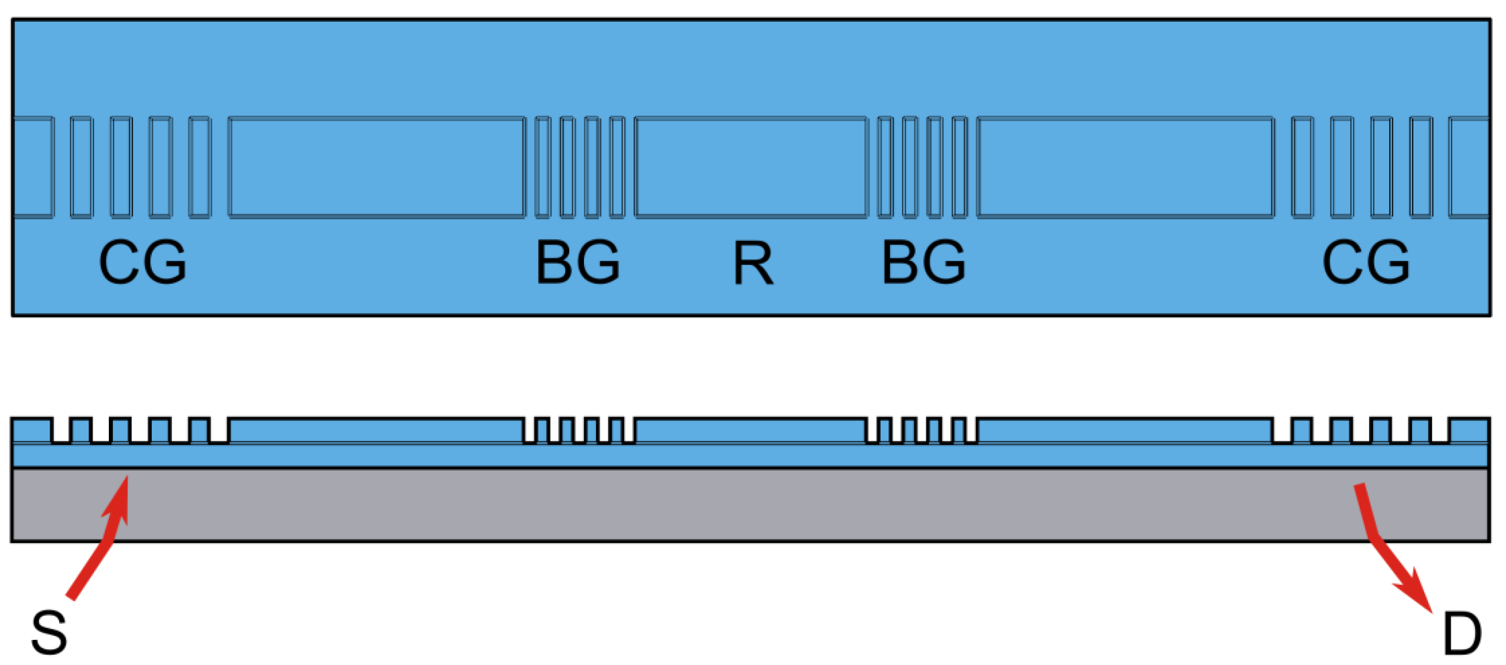 Schematic representation of the sensor (top and side view), comprising a coherent source (S), coupling gratings (CG), Bragg gratings (BG), a resonator (R) and a detector (D).