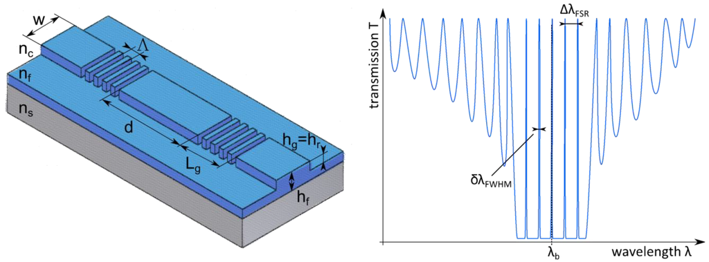 A Fabry-Pérot resonator is an optical oscillator and consists of two spaced reflectors [22]. In the proposed sensor design, the reflectors comprise of corrugated Bragg gratings and the resonator in between of an unstructured waveguide (Figure 4). Due to the high reflectivity of the reflectors, incident light is reflected forwards and backwards within the resonator, thereby creating a stationary wave within the cavity which gives rise to a multitude of resonance peaks within the stop band. The spectral distance between the resonance peaks is called free spectral range (FSR) and the spectral width of the peak can be express via the full width at half maximum (FWHM). The resonator’s FSR and FWHM can be calculated as follows: