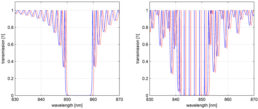 Calculated transmission spectra of the Bragg grating reflector (left) and Bragg grating resonator (right) structure and the associated spectral shift due to a cover refractive index change ∆nc of 0.005 (blue, solid line: nc = 1.329, red, dashed line: nc = 1.335).