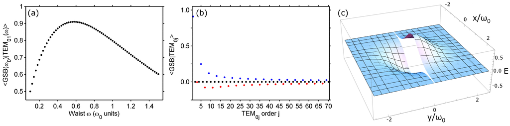 Interferometric precision is more and more demanding as the central frequency of the signal increases. In particular, interferograms in the XUV-domain [15] require highly stable experimental arrangements (for instance, the wavelength of H21, the 21st harmonic order of a 800-nm laser, is about 38nm). In TSI, the reference beam is used to heterodyne the signal, id est, the signal is transferred to a lower frequency. Recently, several TSI schemes were developed using amplitude division [15,16,17,18] and wave-front division [1,19]. All-transmissive schemes are more adapted to this kind of experiment than a Michelson or Mach–Zehnder interferometer, since they intrinsically offer higher stability. In a recent paper [20], TSI was implemented to determine the amount of orbital angular momentum carried by HHG using diffractive optical element (DOE) beam splitting [21]. In [14], we instead based our two source setup on the spatial mode conversion of the driving laser beam. In the absence of a chirp-pulse amplification (CPA) digital laser [22] providing on-demand mode femtosecond pulses, we used a 0-π phase plate to implement the mode conversion [23,24,25,26]. As shown in Figure 2a, we computed the overlap integral between the Gaussian phase-plate-shaped beam (GSB; see Figure 2c) of waist and a TEM01 mode. Both electric fields are considered collimated. We find that a maximum of 90.94% of the input Gaussian beam is converted into the TEM01 mode of waist . This value is slightly smaller than the 93% reported in [26], but still rather close. This conversion rate could be improved by using a cylindrical lens to adjust the waist of the transmitted beam in the direction orthogonal to the 0-π step. In Figure 2b, we show the overlap integral between the GSB and higher TEM0i modes with waist . As expected, the overlap integral with TEM02i modes is zero, while TEM04j+1 and TEM04j+3 contribute with opposite signs and a decreasing amplitude as j increases. These higher order contributions are revealed at the focus of a lens as diffraction peaks in the surroundings of the two bright spots of interest. However, the intensity in these undesired diffraction patterns is not strong enough to induce the HHG non-linear non-perturbative process (see [14]).