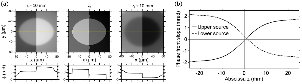 HHG in the gas phase is a macroscopic emission process and is therefore subjected to specific phase matching conditions. These conditions are strongly influenced by the phase of the microscopic harmonic dipole moment, which was shown to depend linearly on the laser intensity [27,28]. Consequently, intensity variations in the fundamental beam induce strong phase variations in the harmonic emission. By contrast, in the vicinity of a maximum, this phase is stationary, such that harmonics are emitted along the direction orthogonal to the local phase front. In each bright spot created by the phase plate at the focus of a lens, the phase front inclination at the peak intensity determines the direction in which the harmonics are emitted. If the phase front tilt in the two foci is unfavorable, the two harmonic beams may not overlap in the far-field, preventing interferences. Figure 3a shows the phase front of the GSB at the focus of a 1-m focusing lens (central column) and 10mm upstream (left column) and downstream (right column) of the focus. While at the exact focus position, the phase front is almost flat on both sides of the 0-π phase step, a slope appears outside of focus. In order to estimate its impact on HHG, we evaluate this slope at the position of the two harmonic sources, id est, at the points of maximum laser intensity. Figure 3b shows the phase front inclination for each source as a function of the distance along the propagation axis. The two sources see opposite phase slopes, so that, in general, they will emit in different directions. A positive sign in the upper (respectively lower) source phase front slope indicates that the harmonics are propagating towards (resp. away from) the optical axis. We conclude that there is only one position along the propagation direction for which the two emissions are emitted parallel to one another. Note that in this case, the harmonics from the two sources do not propagate along the IR propagation axis, but they are emitted with a small angle (the value of the slope when the two curves cross is not zero). This condition is reached when the jet is placed shortly downstream of the laser focus. This position is known for allowing the phase-matching of both short and long trajectories [27,28]. To conclude this discussion, if the gas target is far enough away from the laser focus (upstream or downstream), the harmonic emission from the two sources will no longer overlap and will not interfere. When the laser focus is placed upstream of the gas jet (), the upper (resp. lower) harmonic emission measured in the far-field will be generated by the upper (resp. lower) source, whereas it will result from the lower (resp. upper) bright spot non-linear interaction with the generating medium if the latter is placed downstream of the laser focus.