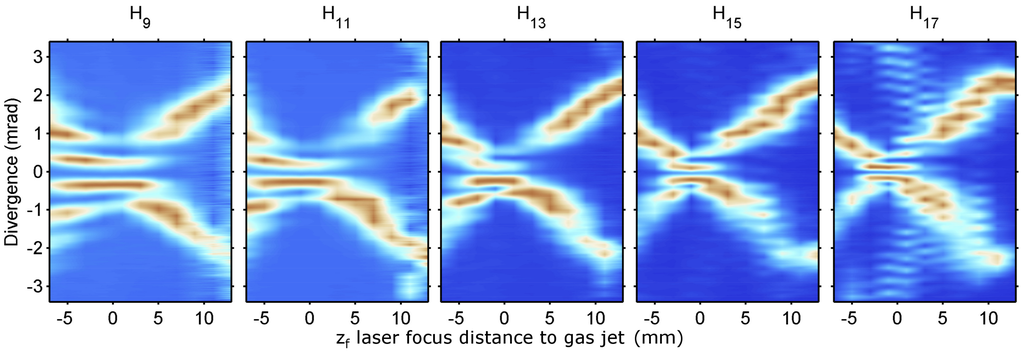 - Mang, M.M.; Bourassin-Bouchet, C.; Walmsley, I.A. Simultaneous spatial characterization of two independent sources of high harmonic radiation. Opt. Lett. 2014, 39, 6142–6145. [Google Scholar] [CrossRef] [PubMed]