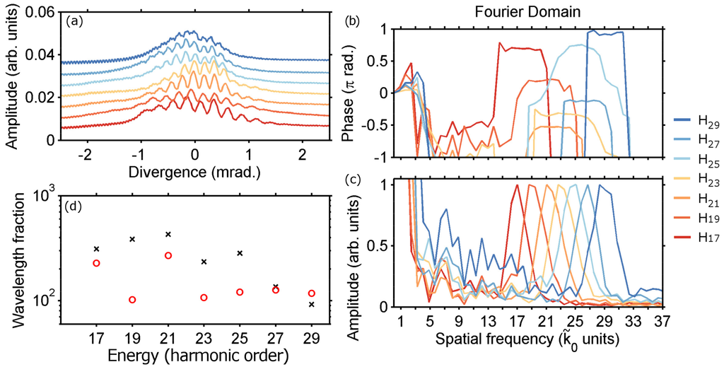 To extract the phase from the interferogram, we choose to integrate each harmonic far-field profile over a fraction of the fundamental photon unit centered at the harmonic frequency and Fourier transform the result. The Fourier transform includes a circular shift of the fringe pattern to account for the linear contribution to the phase inherent to a shift of the center of mass of the harmonic profile with respect to the center of the detector. Figure 6b presents the phase of the Fourier transform of the fringe profiles presented in panel Figure 6a. This phase appears to be well-defined, since it keeps a constant value over the spatial frequency range of the associated amplitude peak (Figure 6c). The value of the HHG phase difference between the two emissions is calculated as the mean value of the Fourier transform phase over the full width at half maximum (FWHM) of the associated amplitude peak. The error in this value is estimated as the standard deviation of the Fourier transform phase over the same spatial frequency range. The inverse of this error times 2π is shown as the red circles in Figure 6d and corresponds to the resolution of our spectrometer in XUV wavelength fraction units. This demonstrates that our interferometer resolution is better than for all harmonic orders investigated.