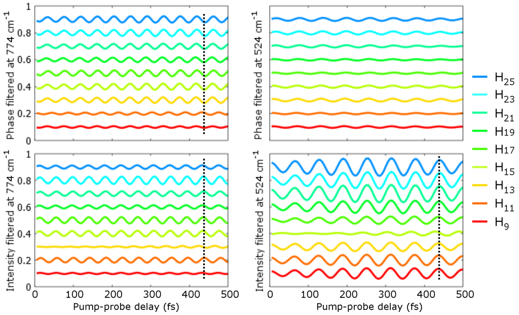 The results reported by Wagner et al. [40] in SF6 were the very first evidence of time-resolved vibrational quantum beats in molecules followed by HHG self-probing spectroscopy. More recently, phase measurements in vibrationally-excited SF6 using a transient excitation grating [43] and our mode-conversion interferometer [44] were reported for H13 to H27. In Figure 8, we present the results extended to H9 and H11, that is to harmonic orders below and at a threshold of SF6 HOMO (15.7eV), HOMO-1 (16.9eV), HOMO-2 (17.2eV) and HOMO-3 (18.3eV). Our previous studies showed that these orbitals may give non-negligible contributions to the harmonic emission [44]. The four panels of Figure 8 show the oscillations of the phase (first row) and intensity (second row) of H9 (red) to H25 (blue) as a function of the pump-probe delay, filtered at two different vibrational mode frequencies: 774cm−1 (-A1g mode, first column) and 524cm−1 (-T1g mode, second column). The first piece of information in Figure 8 is that all harmonic orders show intensity and phase modulations at these two vibrational mode frequencies. Also weaker, the oscillations in the phase signal filtered at 524cm−1 are real and significant. For the three other panels, the oscillations are in phase in all harmonic orders, except one, which shows close to out-of-phase less contrasted oscillations. This is the case for H11 (harmonic generated at a threshold of SF6 HOMO-2) in the phase filtered at 774cm−1, for H13 in the intensity filtered at 774cm−1 and for H15 in the intensity filtered at 524cm−1. As proposed in [44], the dephasing occurring at H13 and H15 in the oscillations of the intensity could be linked to the shape resonance in the B-channel of SF6 (corresponding to ionization from and recombination to HOMO-2). The new result presented here is the dephasing in the oscillations of the phase at H11, which we believe is a similar effect to the one observed at the threshold in the revival of nitrogen.