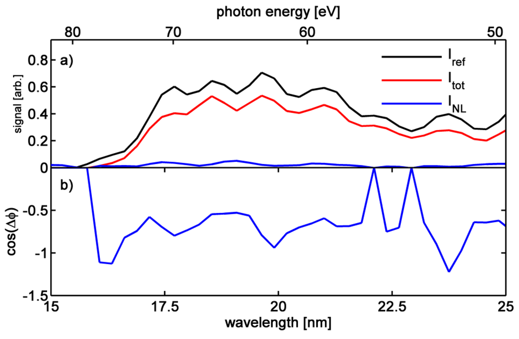 The interference term shows the multiplication and thus amplification of the weak signal, ENL by the stronger one, Eref. The relative phase Δϕ of the two fields is changed experimentally to deduce the amplitude of ENL via the phase dependent intensity. The reference field is always split off the probe pulse before the interaction with the sample by means of a beamsplitter and needs to be recombined with the nonlinear response via a phase stable optical reference path. As mentioned in the introduction, beamsplitting and phase stability requirements are hard to fulfill for short wavelengths in the extreme ultraviolet and soft x-ray regions.